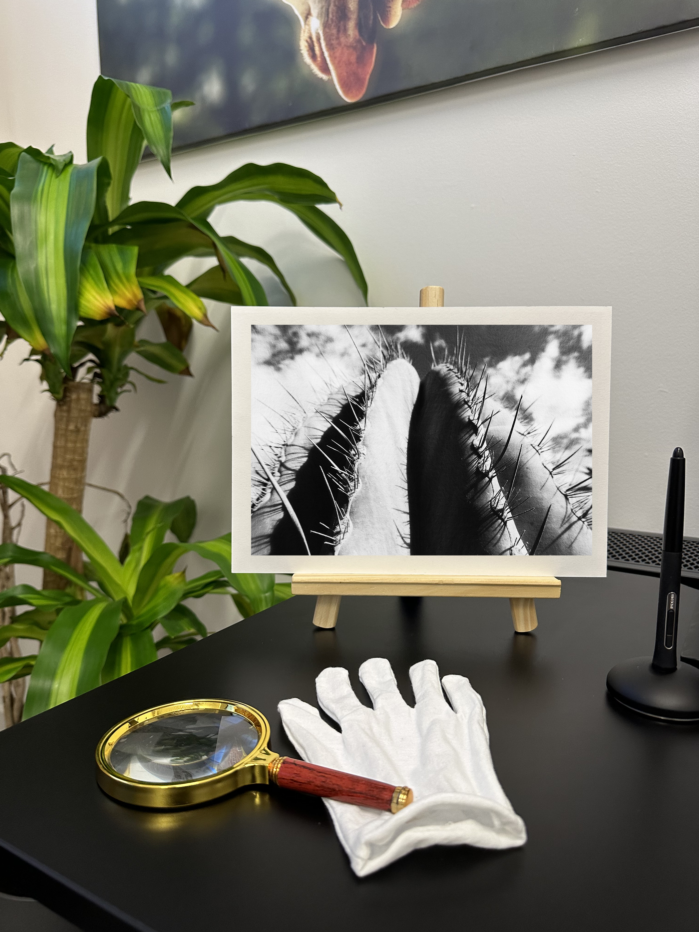 The matte finish of Fine Art paper enhances the rich hues of the cactus, creating beautiful tonal variations from light to dark. This interplay of textures and Monochromatic tonality adds depth to the piece, inviting closer inspection of the cactus's intricate defensive structures.