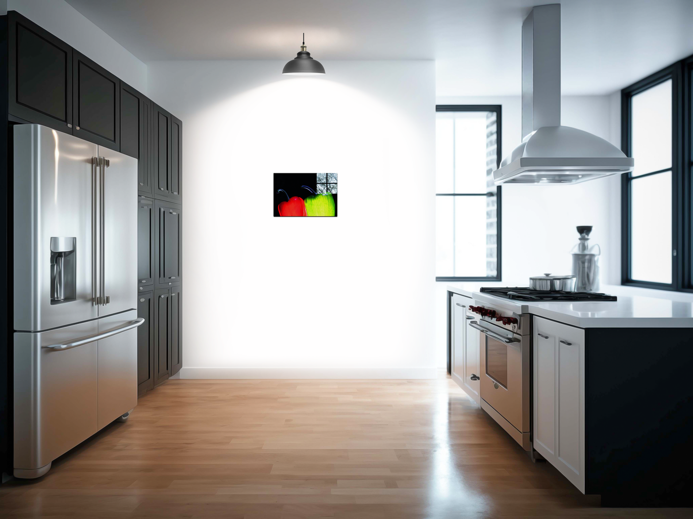 Presented as an Acrylic print, this image achieves an almost three-dimensional quality. The high-gloss finish of our premium Acrylic material intensifies the rich colours and deep blacks, while creating an impression that the peppers are suspended within the piece itself. The resulting sense of depth is truly remarkable, making this artwork particularly suited to contemporary interiors, minimalist spaces, or professional environments where its crisp, clean aesthetic will make a bold statement.