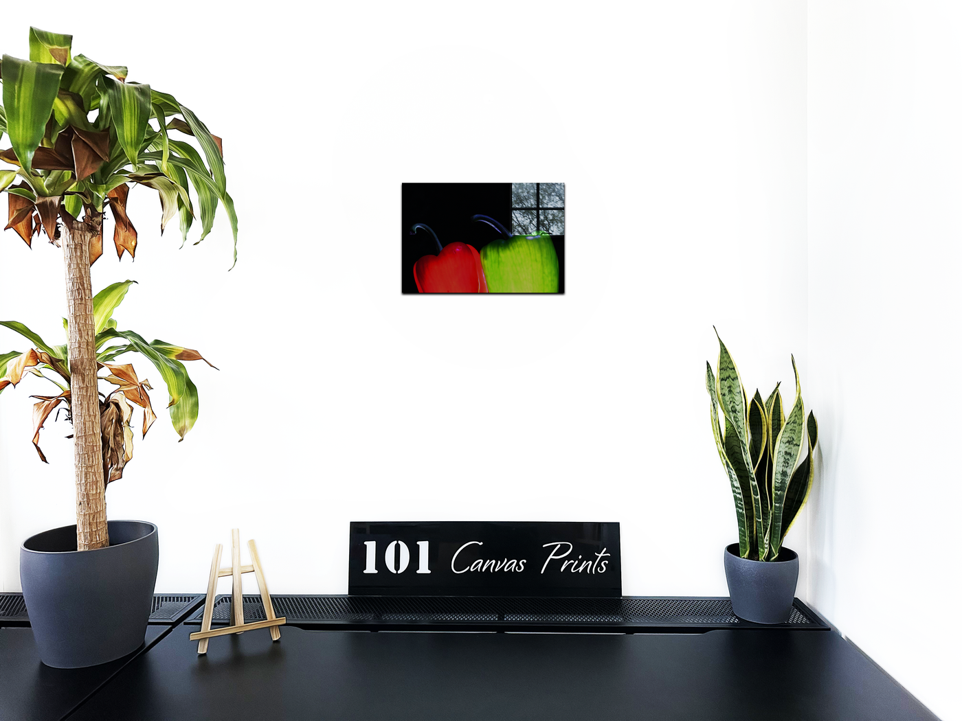 This dramatic modern still life, expertly photographed by the 101 Canvas Prints team, presents a compelling study of two bell peppers in perfect opposition. The photograph's carefully controlled lighting brings out an extraordinary range of tones.