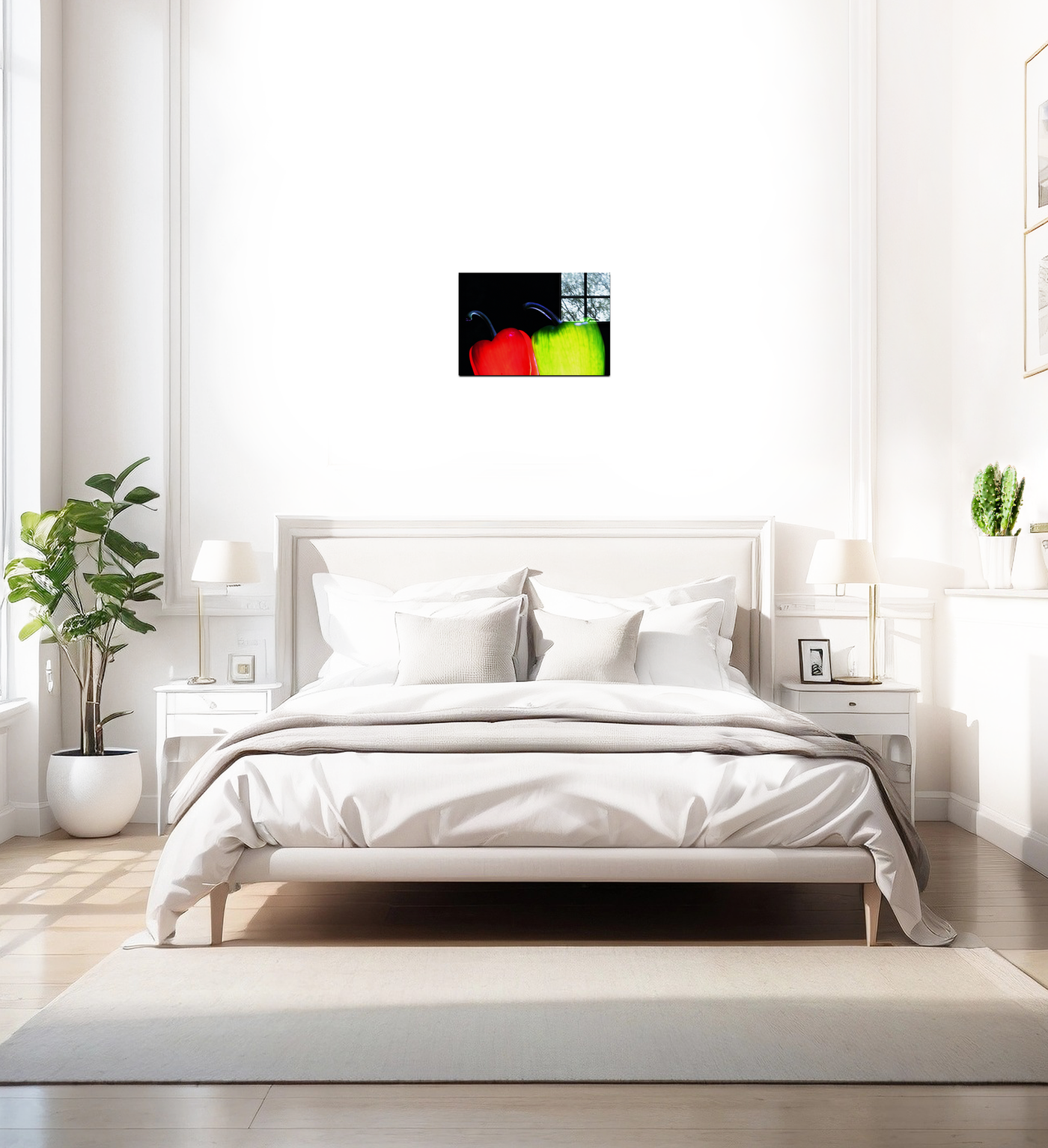 Our skilled print enhancement team have elevated every nuance, from the glossy highlights on the peppers' smooth skin to the subtle shadows that define their sculptural forms. The stark contrast between the vibrant red and the fresh, vital green creates a dynamic interplay that catches the eye and holds it.