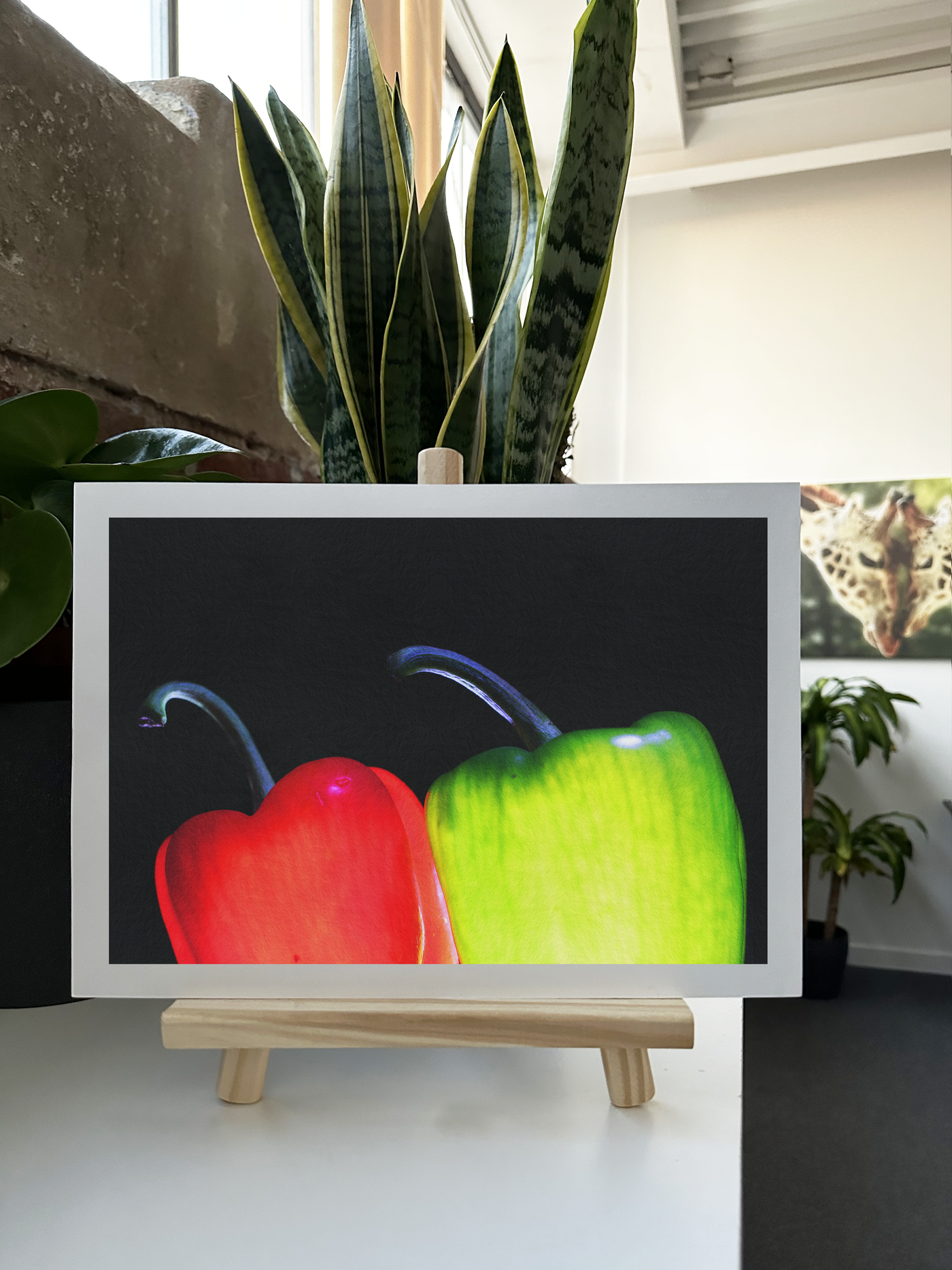 The photograph's colour palette is boldly minimalistic, showcasing the intense contrast between the peppers' hues. The masterful lighting technique employed by our photographers reveals subtle variations in tone, from the deep crimson of the red pepper to the yellowish highlights of its green companion. The natural texture of the peppers' skin, with its gentle undulations and subtle sheen, has been carefully preserved through our precise print enhancement process.