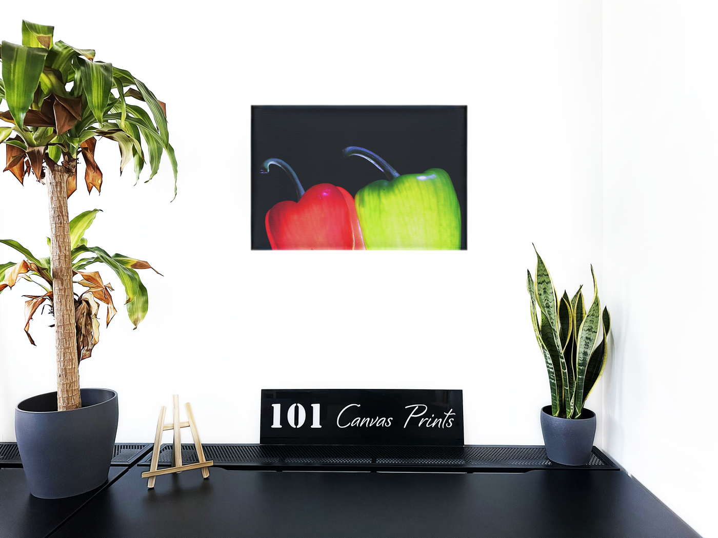 Captured with remarkable precision by the 101 Canvas Prints photography team, this striking composition features two bell peppers - one vibrant red and one lime green - set against a pure black background. The intimate close-up perspective highlights the natural curves and graceful stems of these kitchen garden favourites, creating an elegant still life that elevates everyday produce to Fine Art.