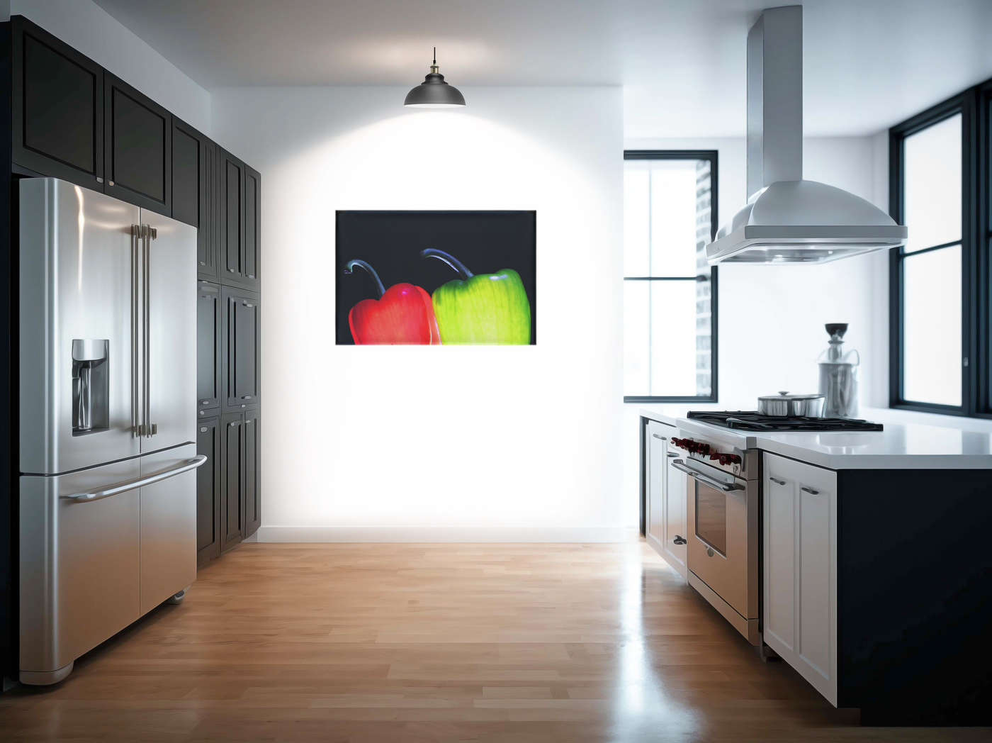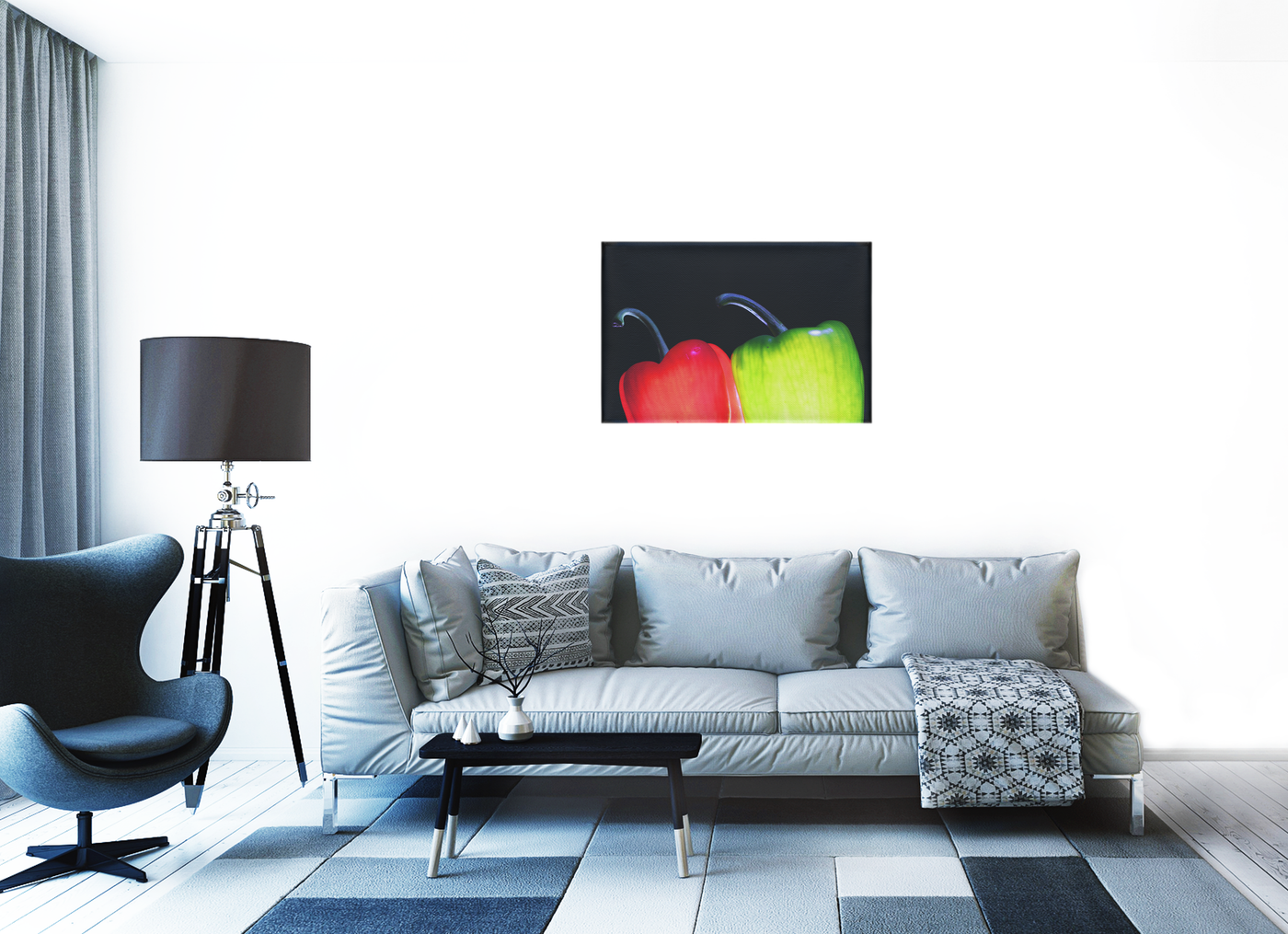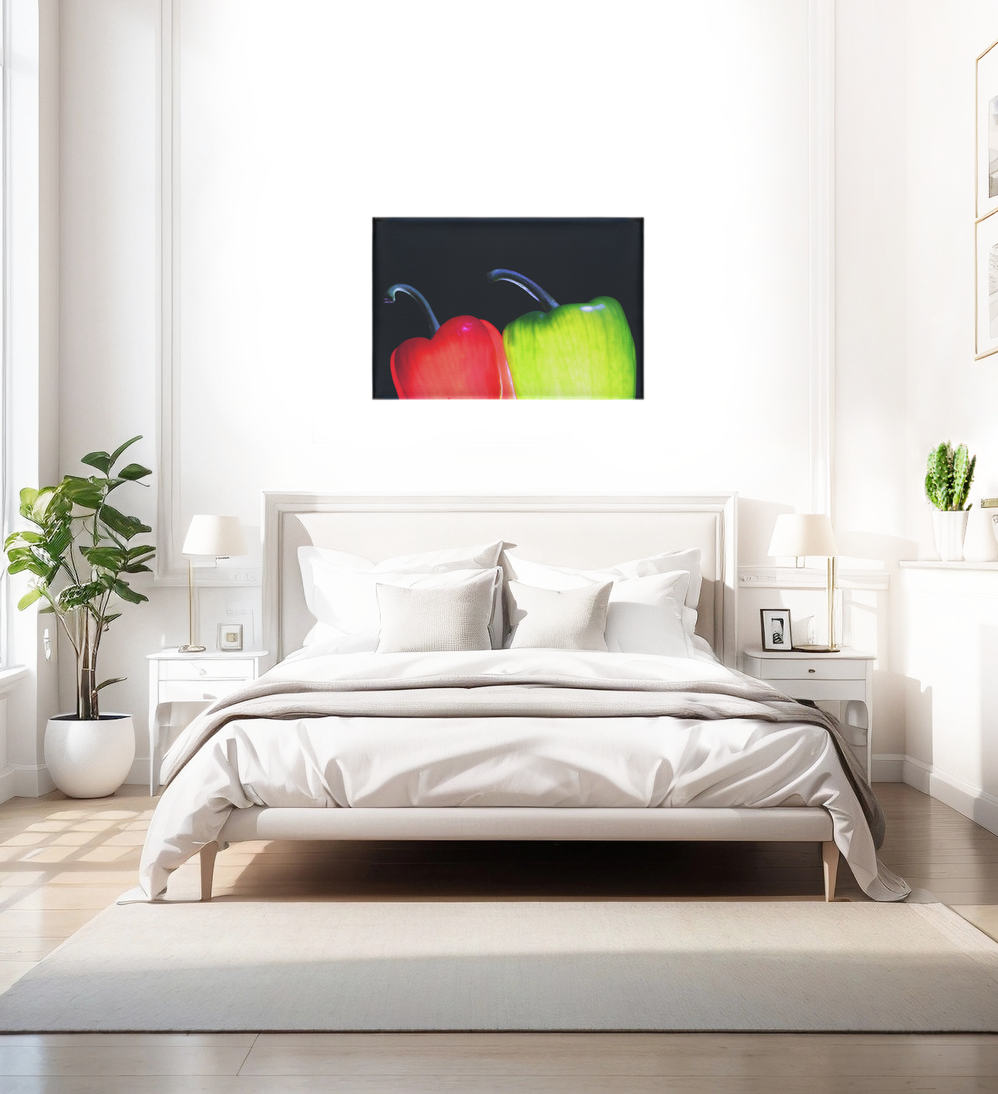 The photograph's colour palette is boldly minimalistic, showcasing the intense contrast between the peppers' hues. The masterful lighting technique employed by our photographers reveals subtle variations in tone, from the deep crimson of the red pepper to the yellowish highlights of its green companion. The natural texture of the peppers' skin, with its gentle undulations and subtle sheen, has been carefully preserved through our precise print enhancement process.