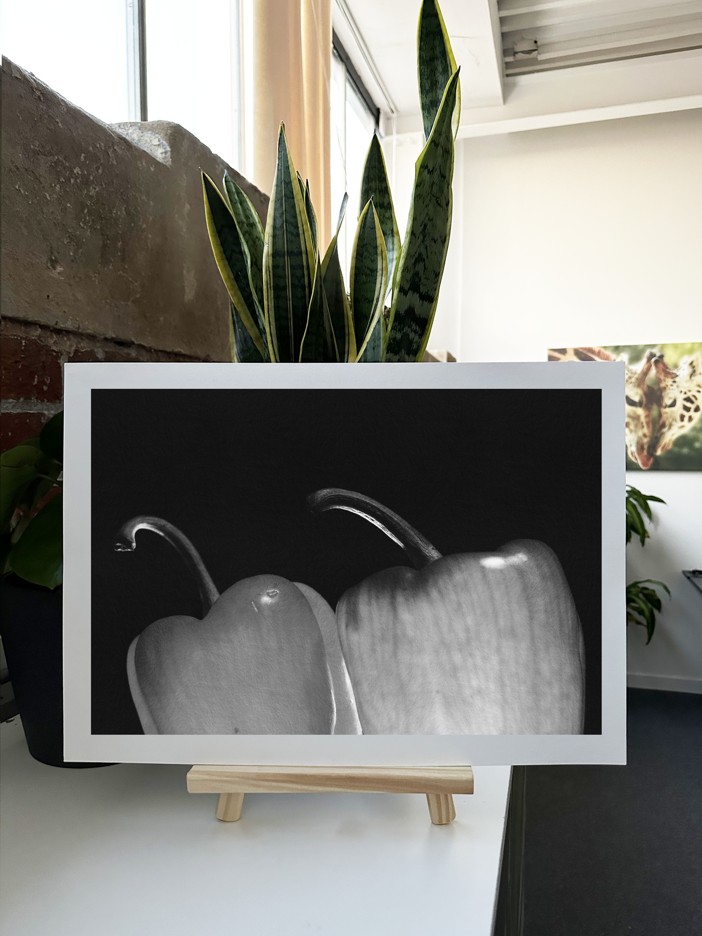 The photograph's Monochrome palette is boldly minimalistic, showcasing the intense contrast between the peppers' hues. The masterful lighting technique employed by our photographers reveals subtle variations in tone. The natural texture of the peppers' skin, with its gentle undulations and subtle sheen, has been carefully preserved through our precise print enhancement process.