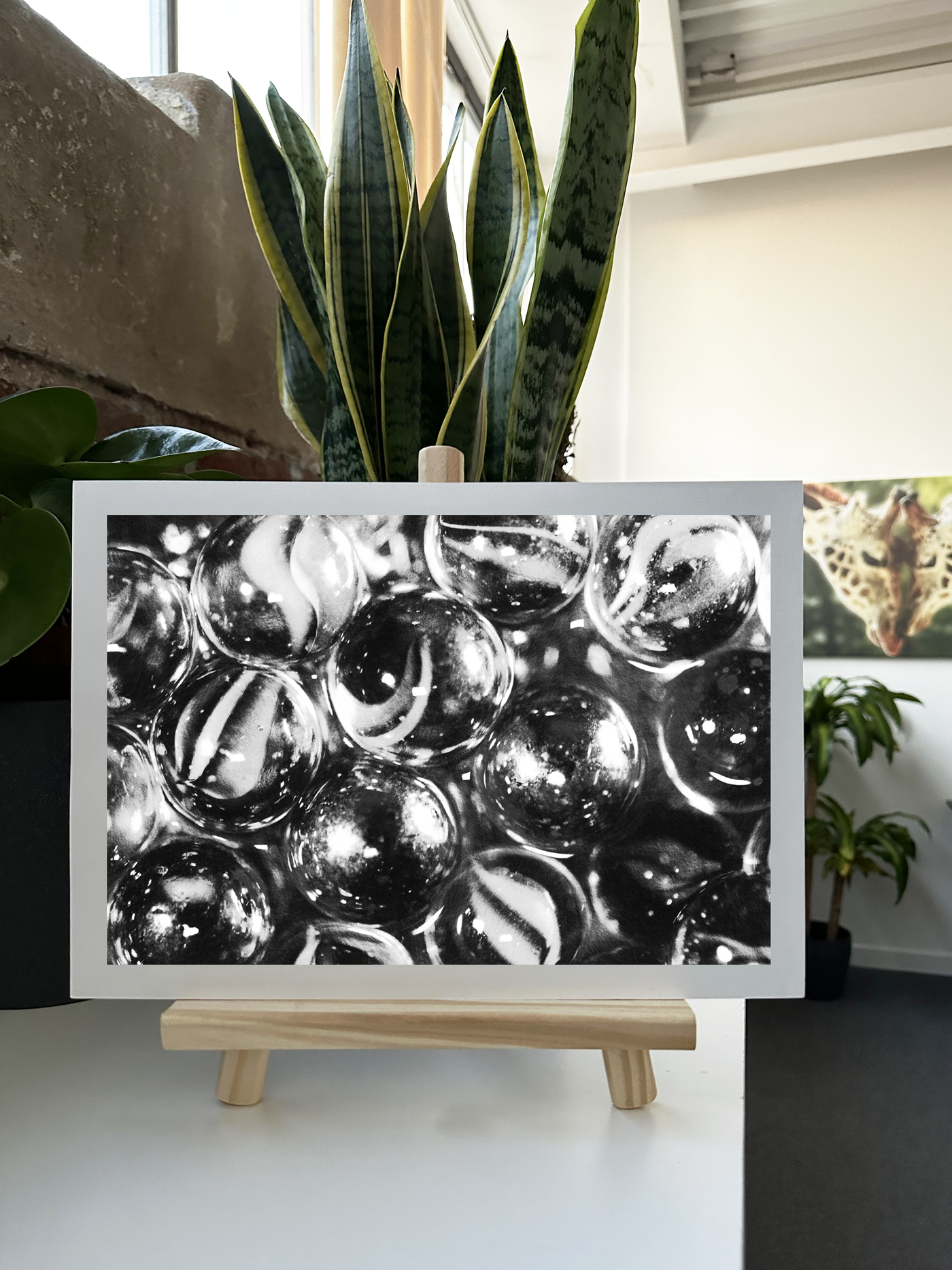 Reproduced on our premium Fine Art paper, this abstract study takes on an additional layer of artistic sophistication. The natural, matte finish of the Fine Art paper provides an interesting contrast to the glossy surfaces of the marbles, creating a unique textural interplay while maintaining the photograph's deep, rich Monochrome tones. This piece would make a striking addition to any contemporary space, particularly in areas where its dreamlike quality can inspire imagination and contemplation.