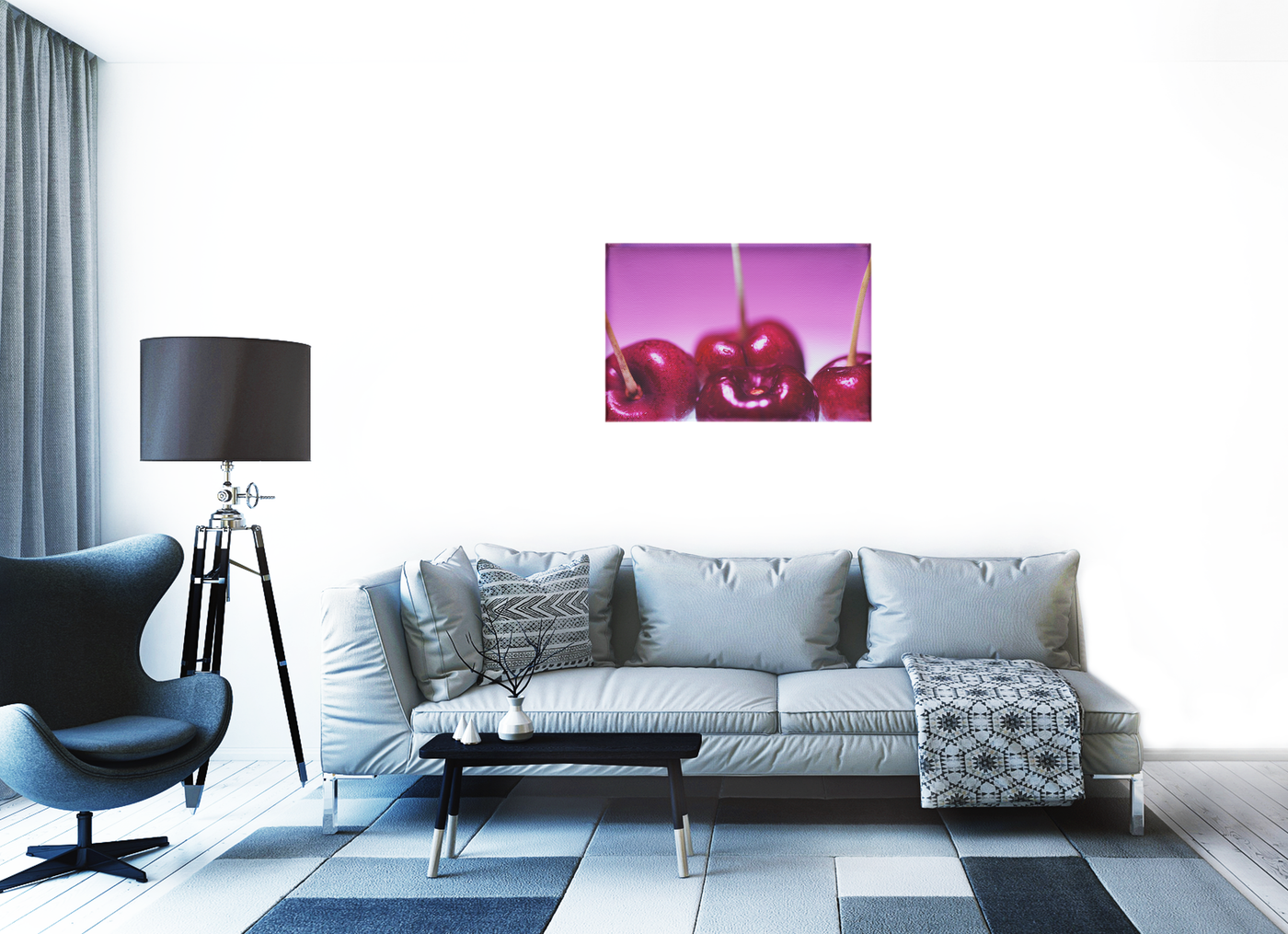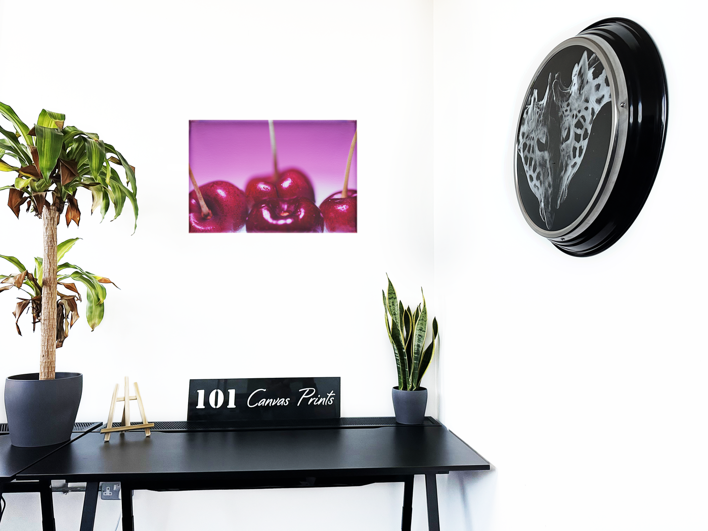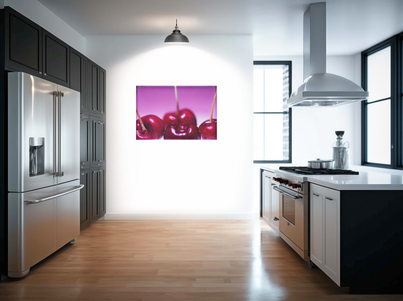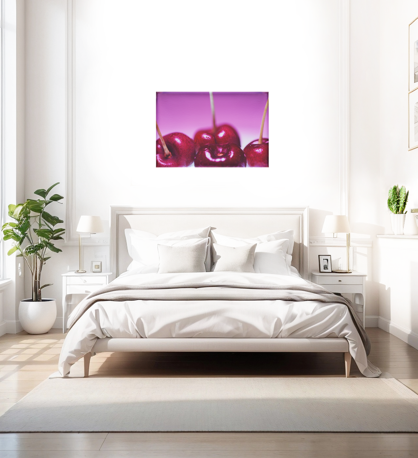 Printed on high-quality Canvas, this image takes on a natural, tactile quality that adds depth to its visual appeal. The texture subtly enhances the cherries' rounded forms, while the matte finish brings out the richness of the reds and pinks. Stretched over a sturdy wooden frame, this Canvas print arrives ready to hang, instantly adding a fresh, contemporary touch to your kitchen, dining room, or any space that could use a splash of vibrant colour.