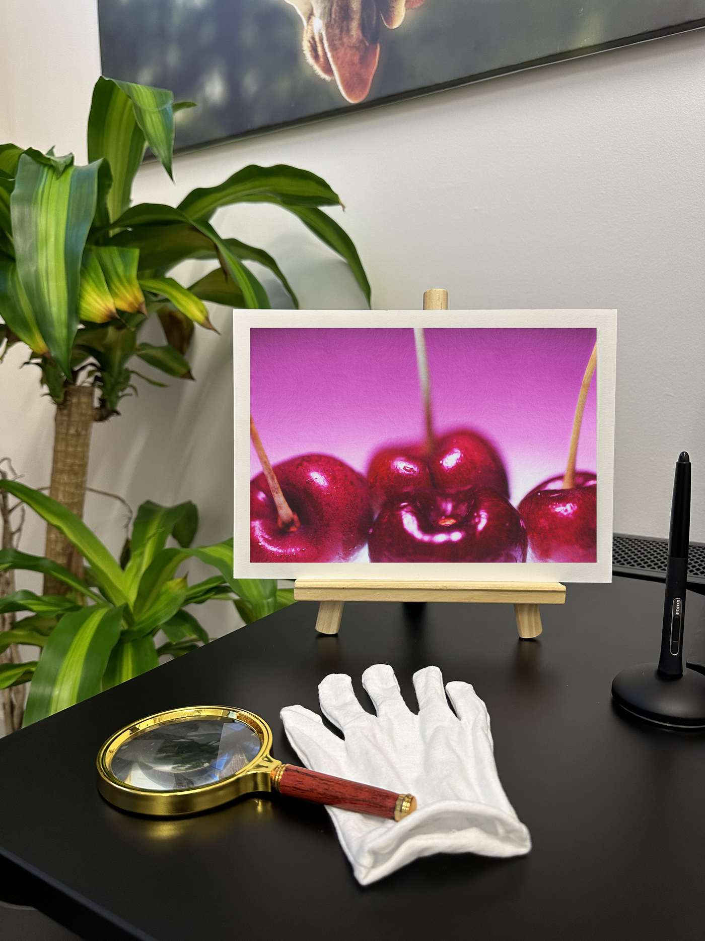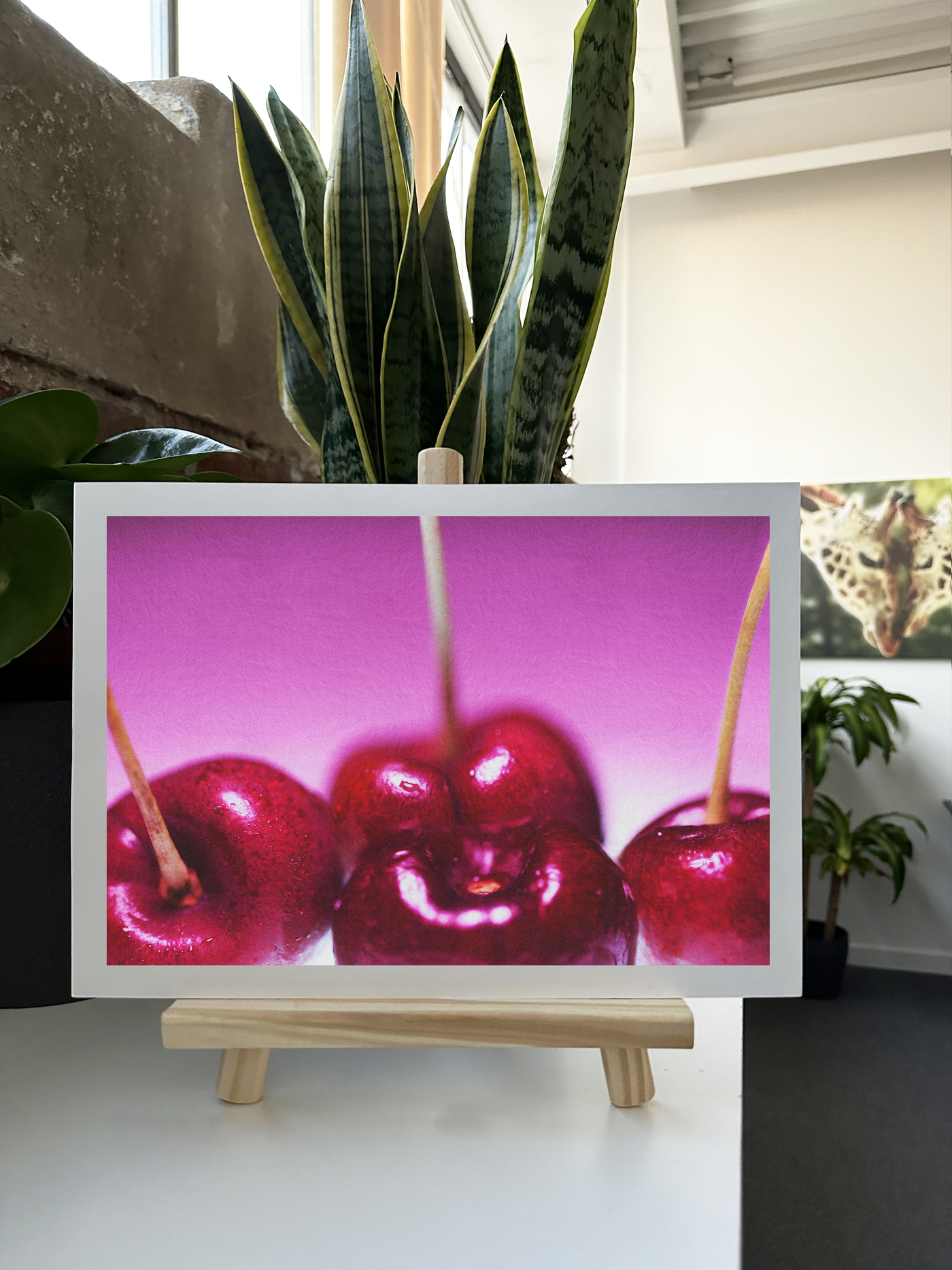 Printed on high-quality Fine Art paper, this image takes on a natural, tactile quality that adds depth to its visual appeal. The texture subtly enhances the cherries' rounded forms, while the matte finish brings out the richness of the reds and pinks. This Fine Art print will instantly add a fresh, contemporary touch to your kitchen, dining room, or any space that could use a splash of vibrant colour.