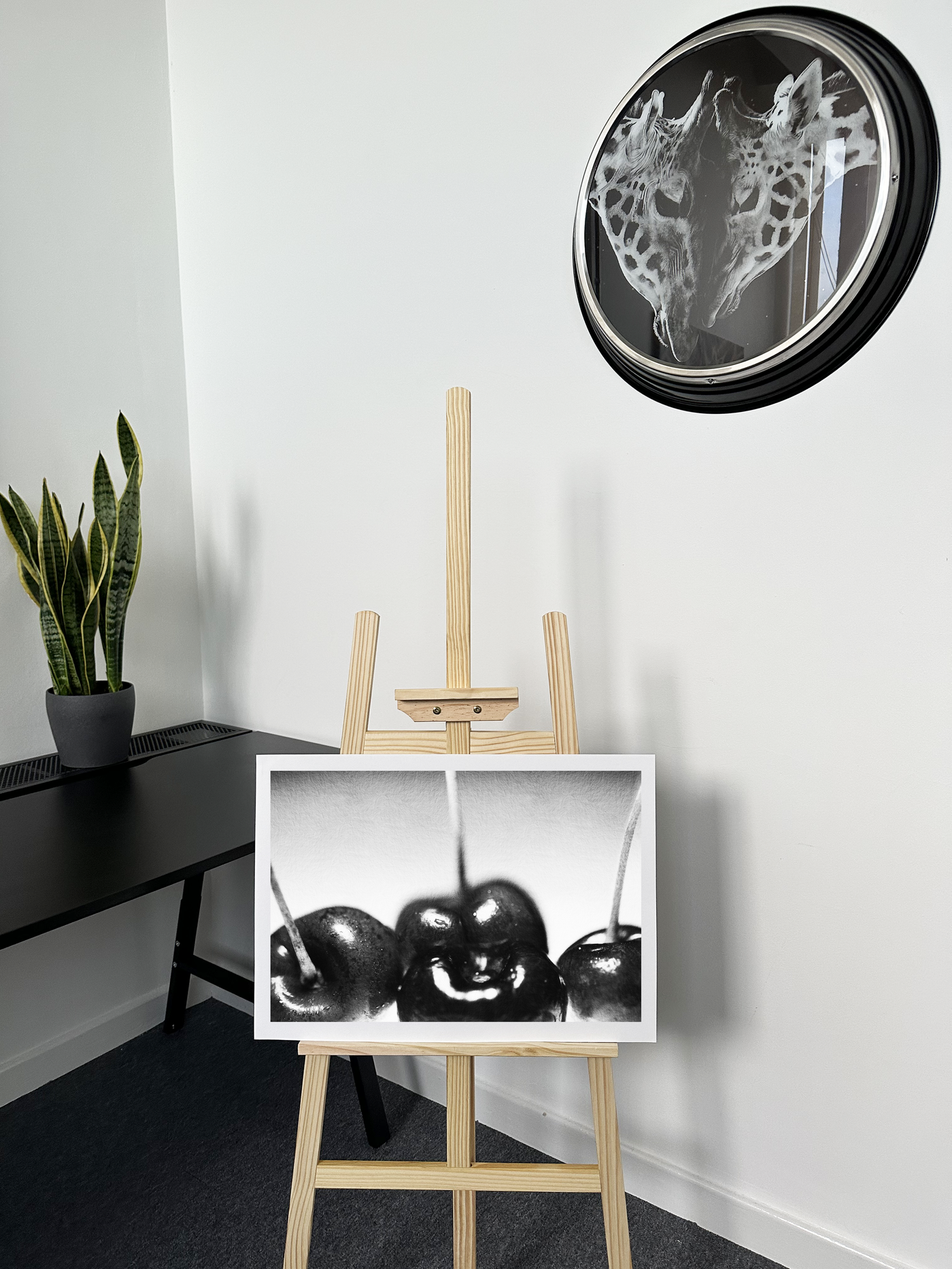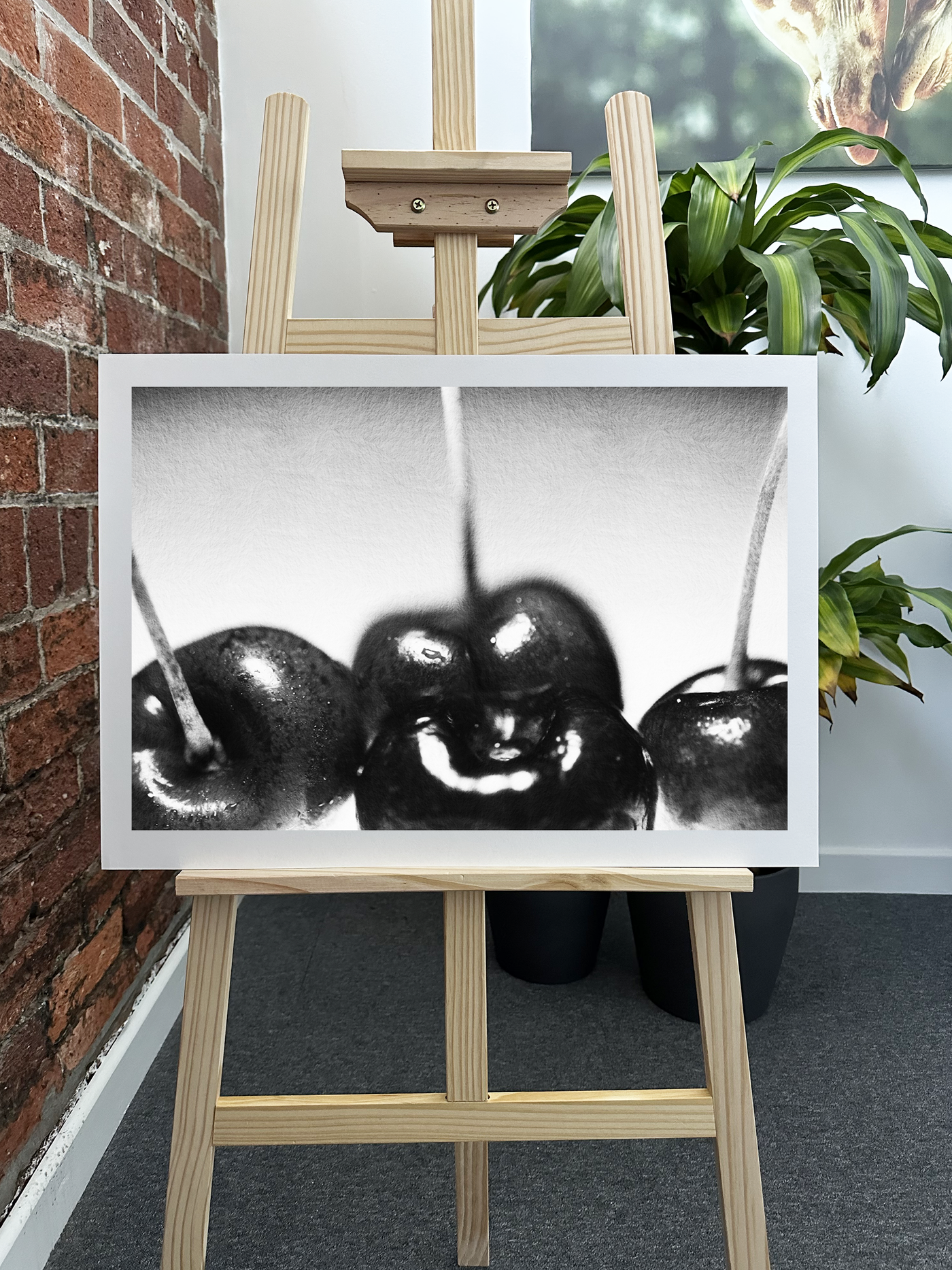 Printed on high-quality Fine Art paper, this image takes on a natural, tactile quality that adds depth to its visual appeal. The texture subtly enhances the cherries' rounded forms, while the matte finish brings out the richness of the Monochrome tones. This Monochrome Fine Art print will instantly add a fresh, contemporary touch to your kitchen, dining room, or any space that could use a splash of vibrant colour.