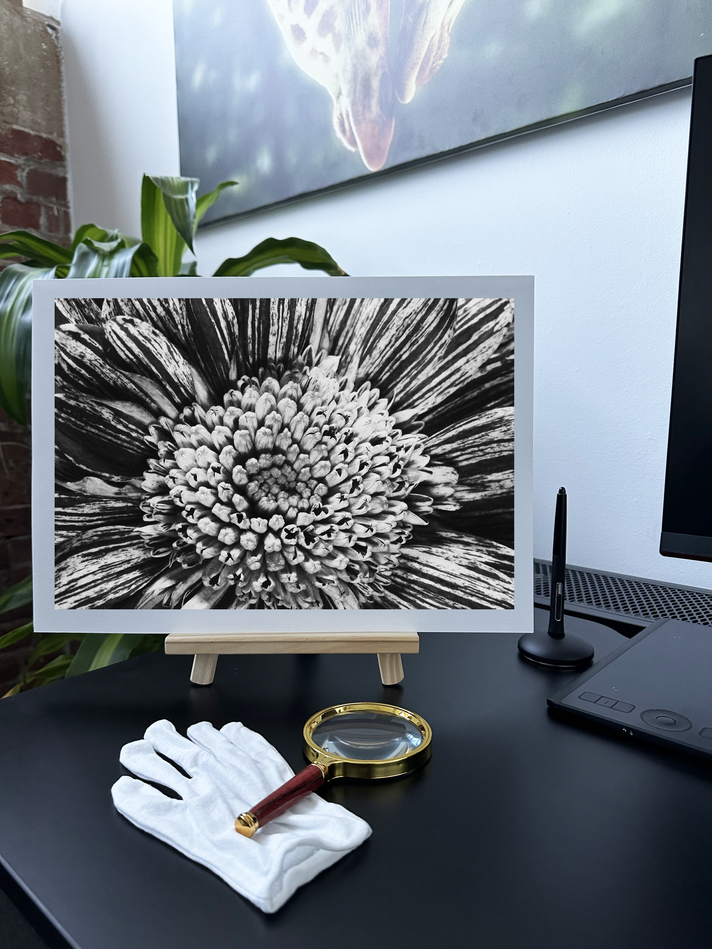 Our carefully handmade monochrome fine art prints are produced on Hahnemühle 308 matte cotton rag paper using Epson archival inks for exceptional detail and color accuracy. Each print features clean, precise edges and a textured surface that brings depth and richness to your chosen artwork, creating a gallery-worthy presentation.