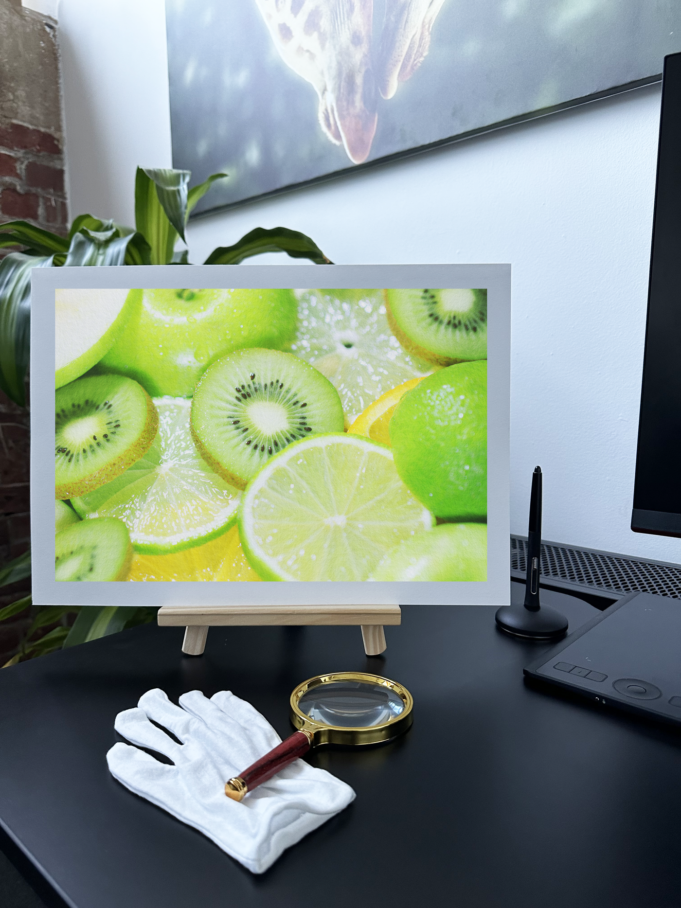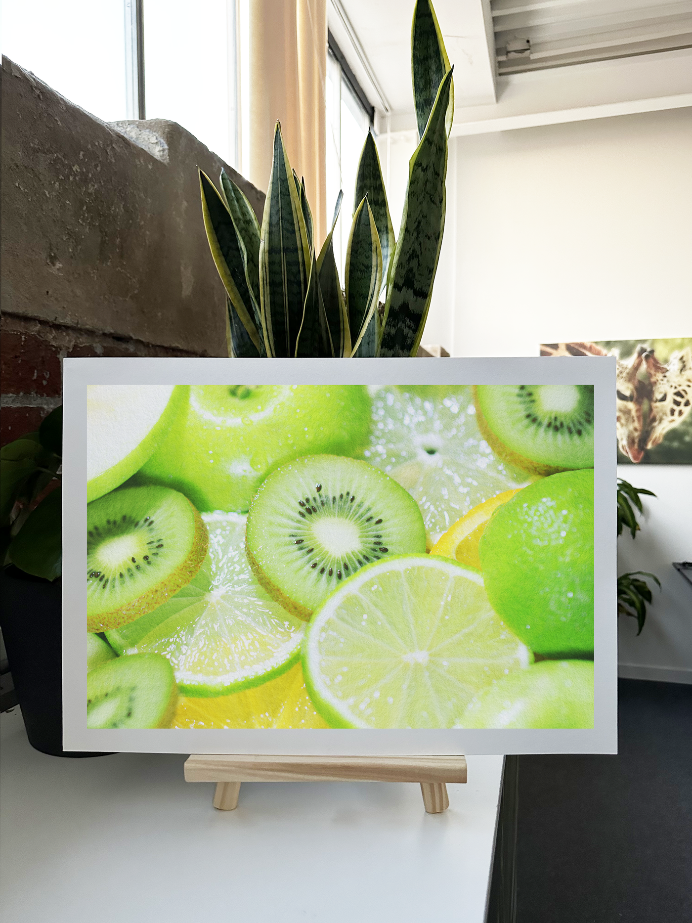 The Fine Art print showcases the intricate details of kiwi flesh, from its tender centre to the tiny black seeds arranged in a mesmerising pattern. Intermingled are wedges of apple & lime, their translucent segments promising a burst of citrusy flavour. Delicate water droplets scattered across the fruits add a sense of coolness and freshness to the composition.