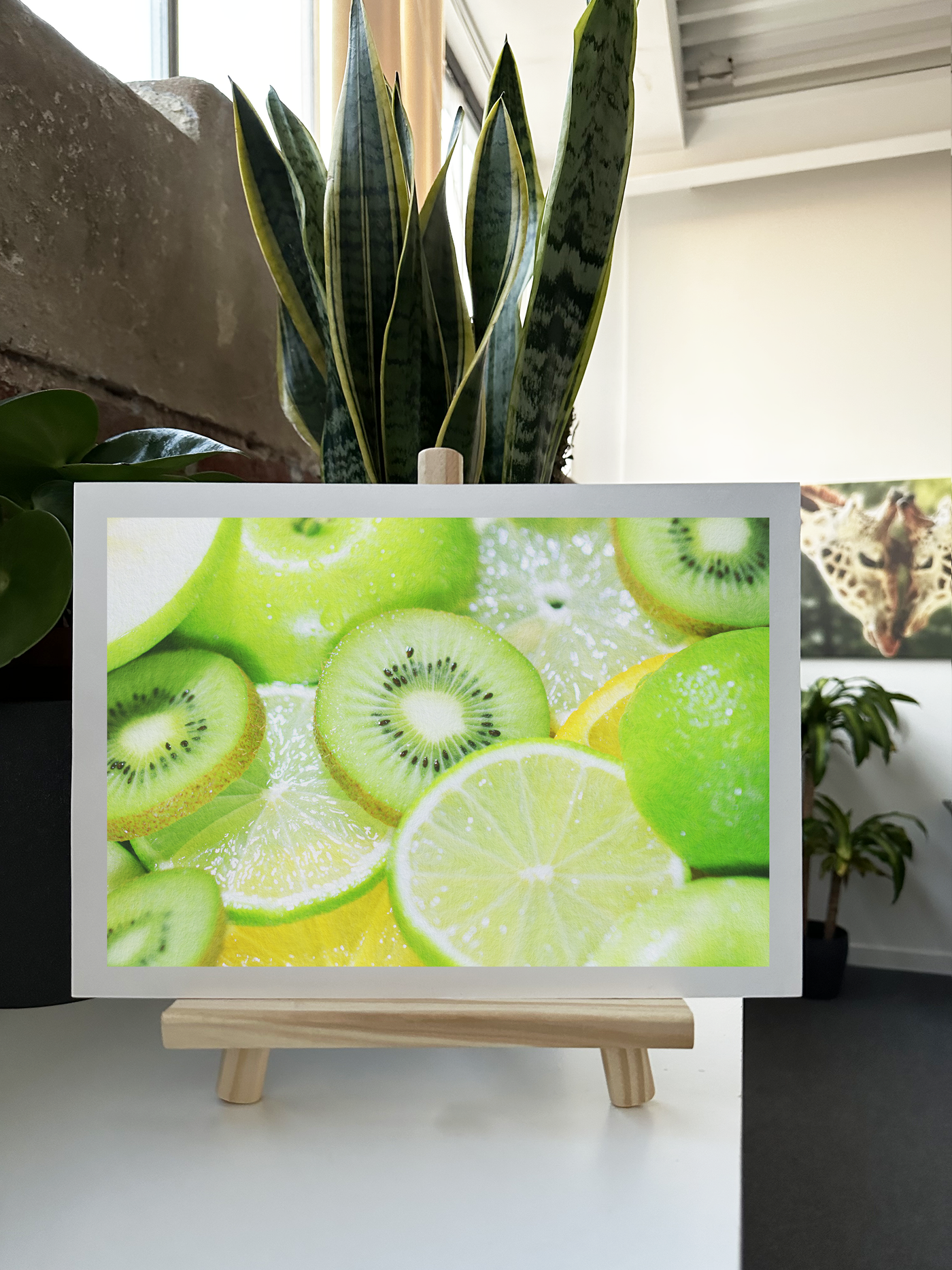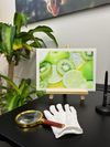 The Fine Art print showcases the intricate details of kiwi flesh, from its tender centre to the tiny black seeds arranged in a mesmerising pattern. Intermingled are wedges of apple & lime, their translucent segments promising a burst of citrusy flavour. Delicate water droplets scattered across the fruits add a sense of coolness and freshness to the composition.