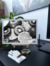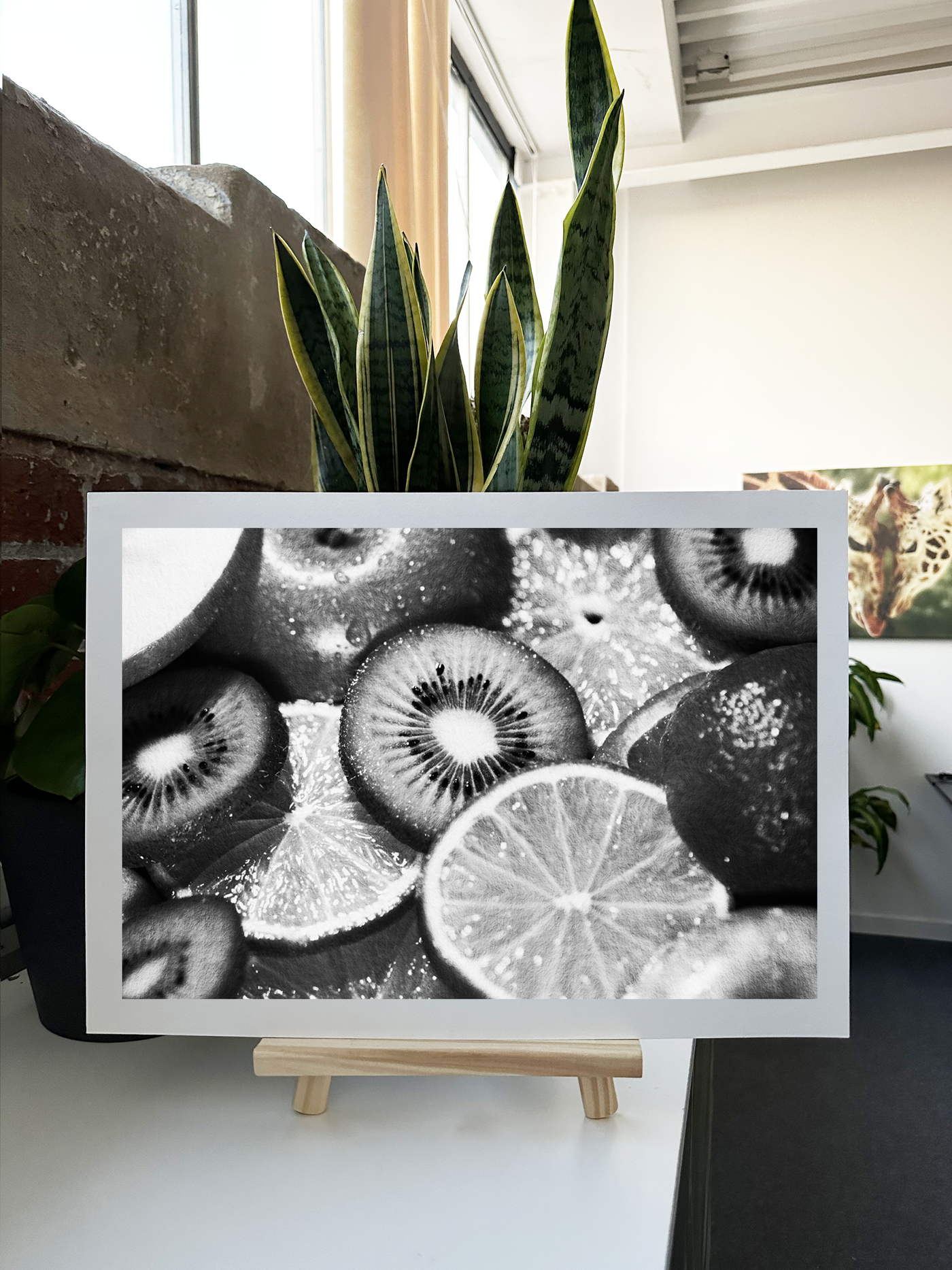 The Monochrome Fine Art print showcases the intricate details of kiwi flesh, from its tender centre to the tiny black seeds arranged in a mesmerising pattern. Intermingled are wedges of apple & lime, their translucent segments promising a burst of citrusy flavour. Delicate water droplets scattered across the fruits add a sense of coolness and freshness to the composition.