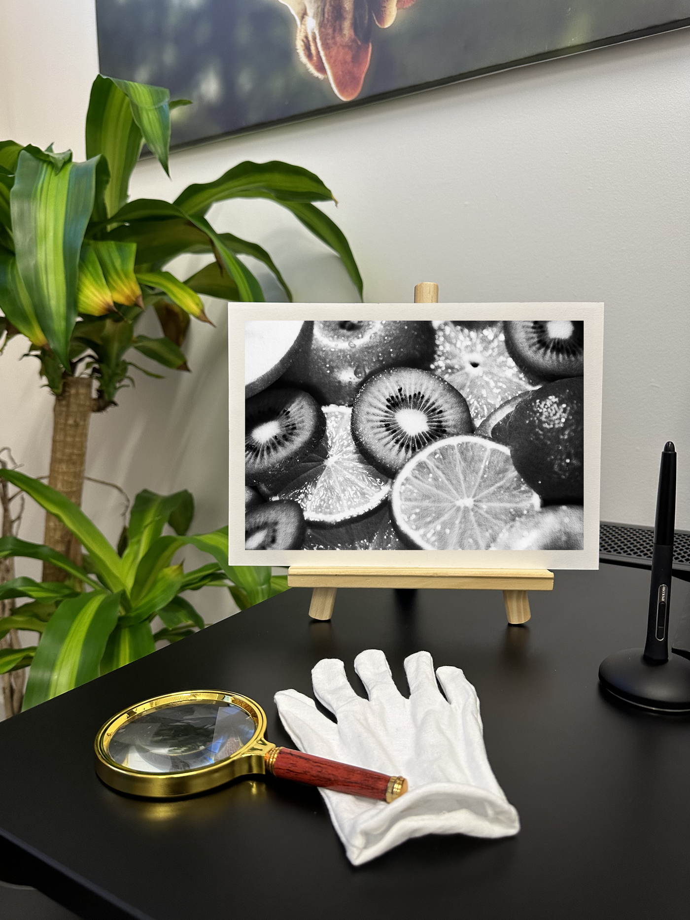 The Monochrome Fine Art print showcases the intricate details of kiwi flesh, from its tender centre to the tiny black seeds arranged in a mesmerising pattern. Intermingled are wedges of apple & lime, their translucent segments promising a burst of citrusy flavour. Delicate water droplets scattered across the fruits add a sense of coolness and freshness to the composition.
