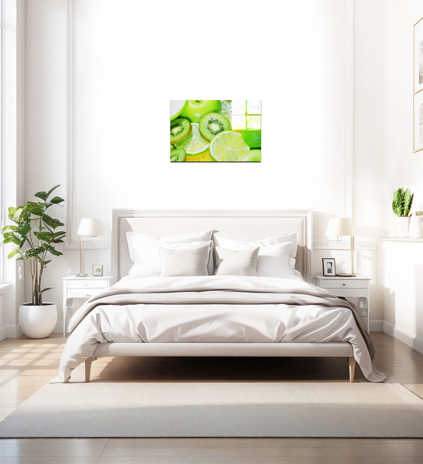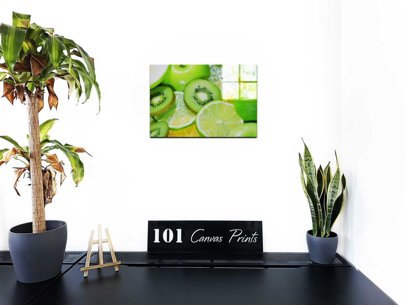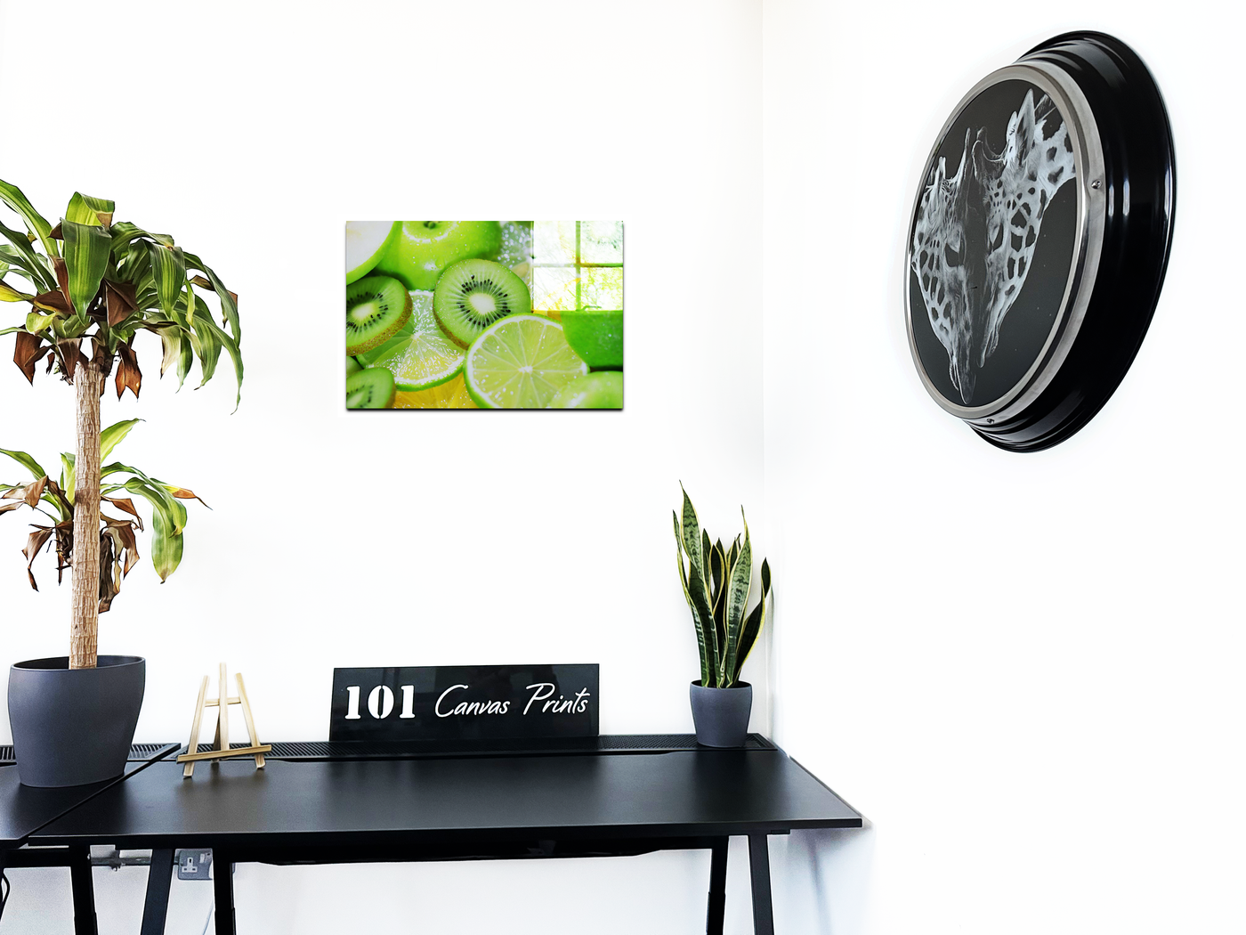 Dive into a world of zesty freshness with this vibrant Acrylic print from 101 Canvas Prints. Our photography team has masterfully captured the juicy essence of kiwis, limes & apples in stunning detail. The crisp, high-definition image showcases the intricate patterns of sliced kiwi fruit, their tiny black seeds contrasting beautifully against the vibrant green flesh. Nestled alongside are succulent lime and apple wedges, their translucent segments glistening with tangy promise.