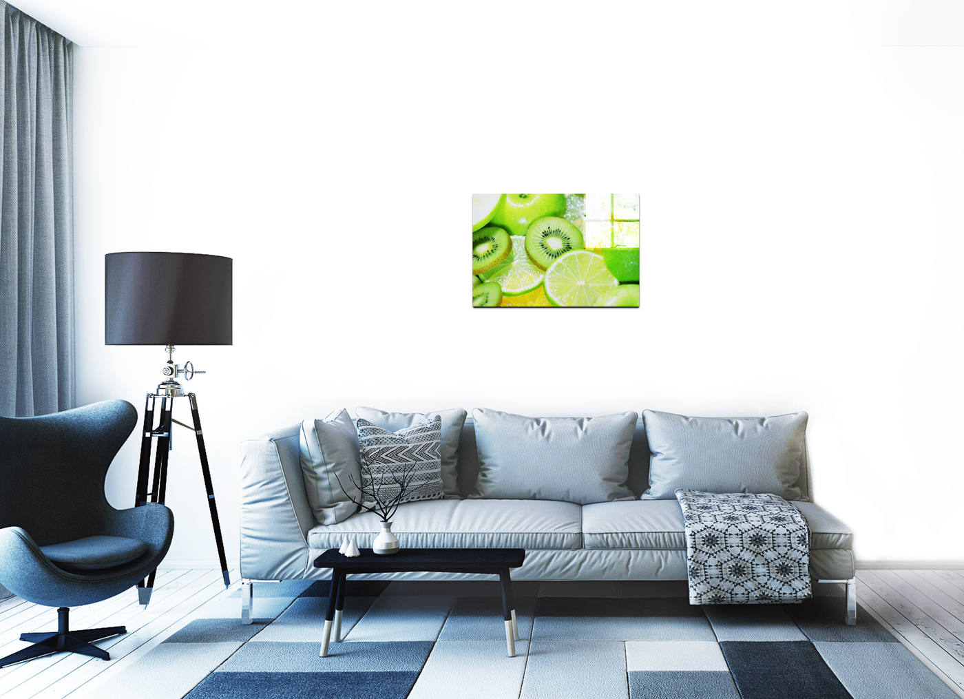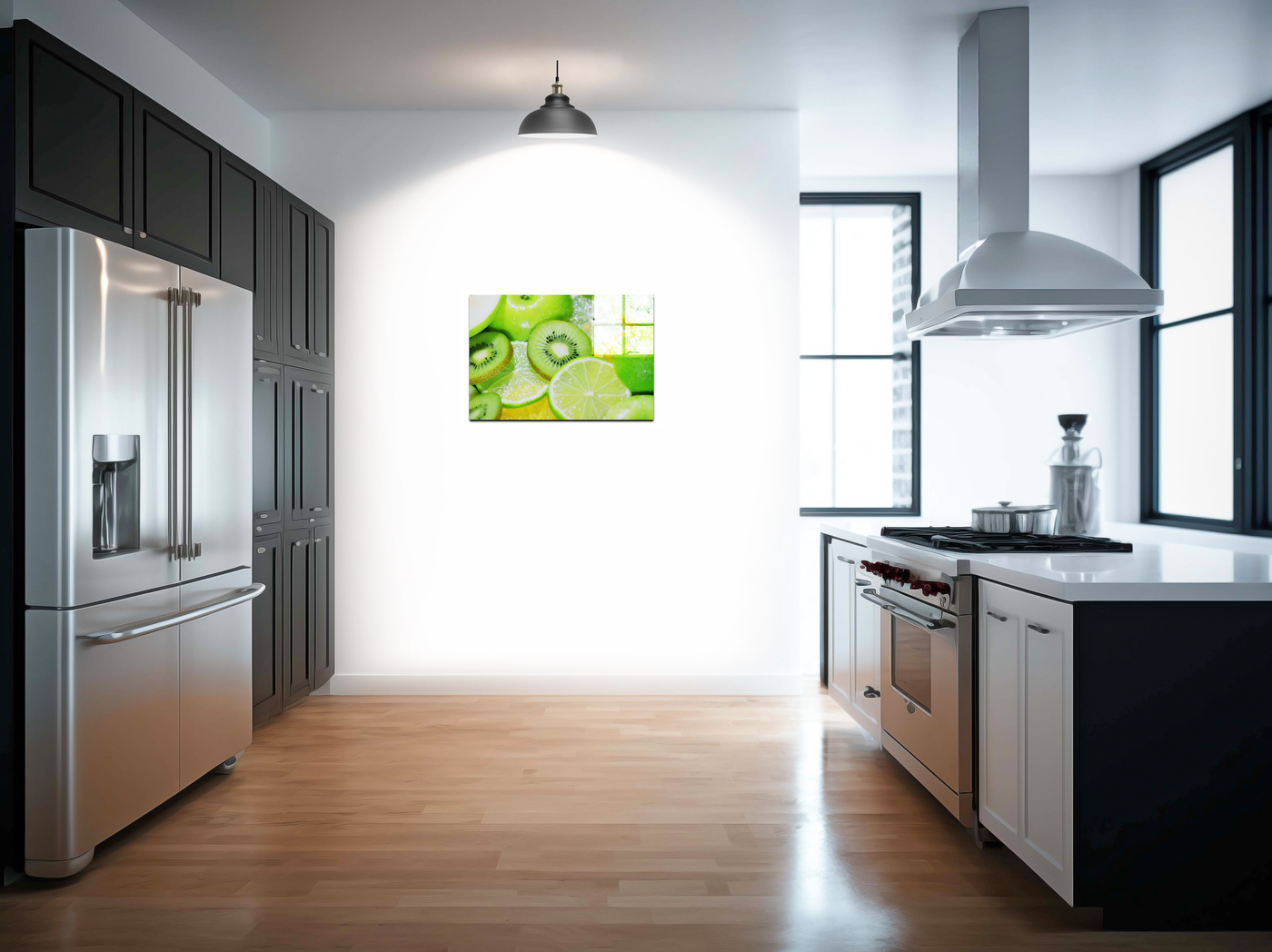 The Acrylic medium elevates this image to new heights, lending a glossy, almost three-dimensional quality to the fruit. The deep, rich greens seem to pop off the surface, whilst the delicate water droplets appear so realistic you'll be tempted to reach out and touch them. This piece is perfect for adding a burst of colour and energy to any kitchen, dining area, or contemporary living space.