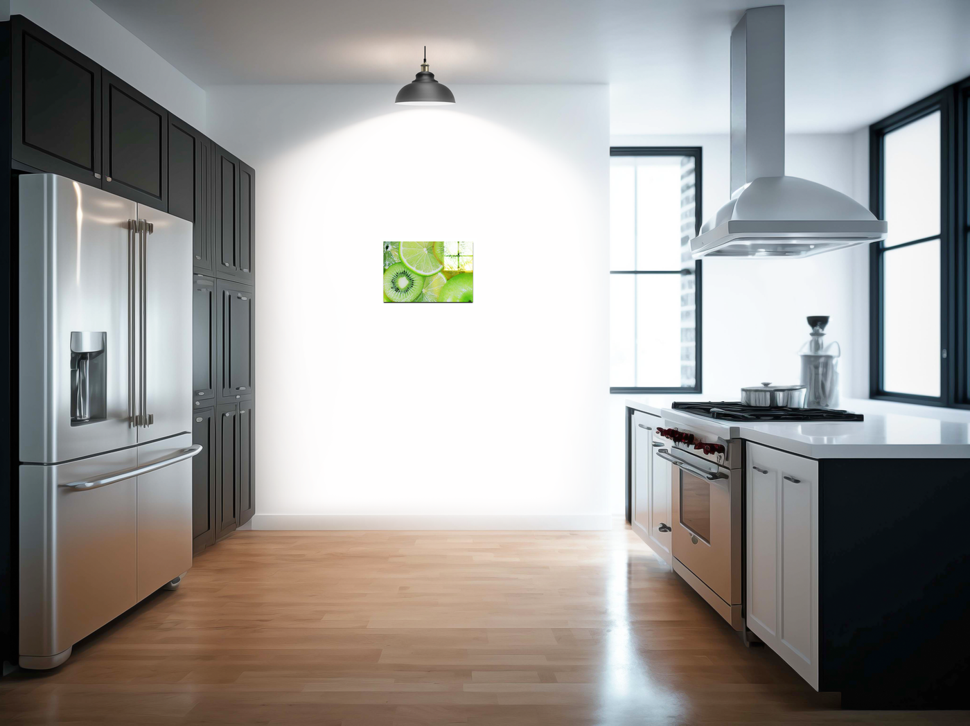 The Acrylic medium amplifies the vibrancy of this composition, lending a glossy sheen that mimics the fruits' natural juiciness. Water droplets scattered across the surface seem to leap from the print, creating an almost three-dimensional effect. The interplay of textures from the grainy kiwi to the smooth lime rind is emphasised, inviting viewers to almost feel the fruits' varied surfaces.