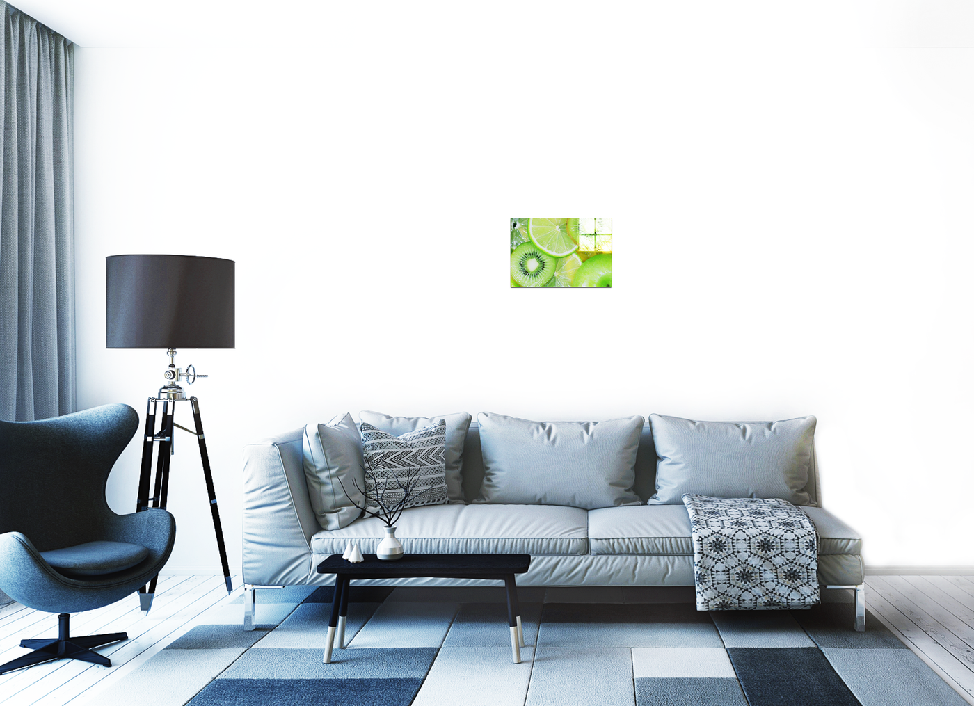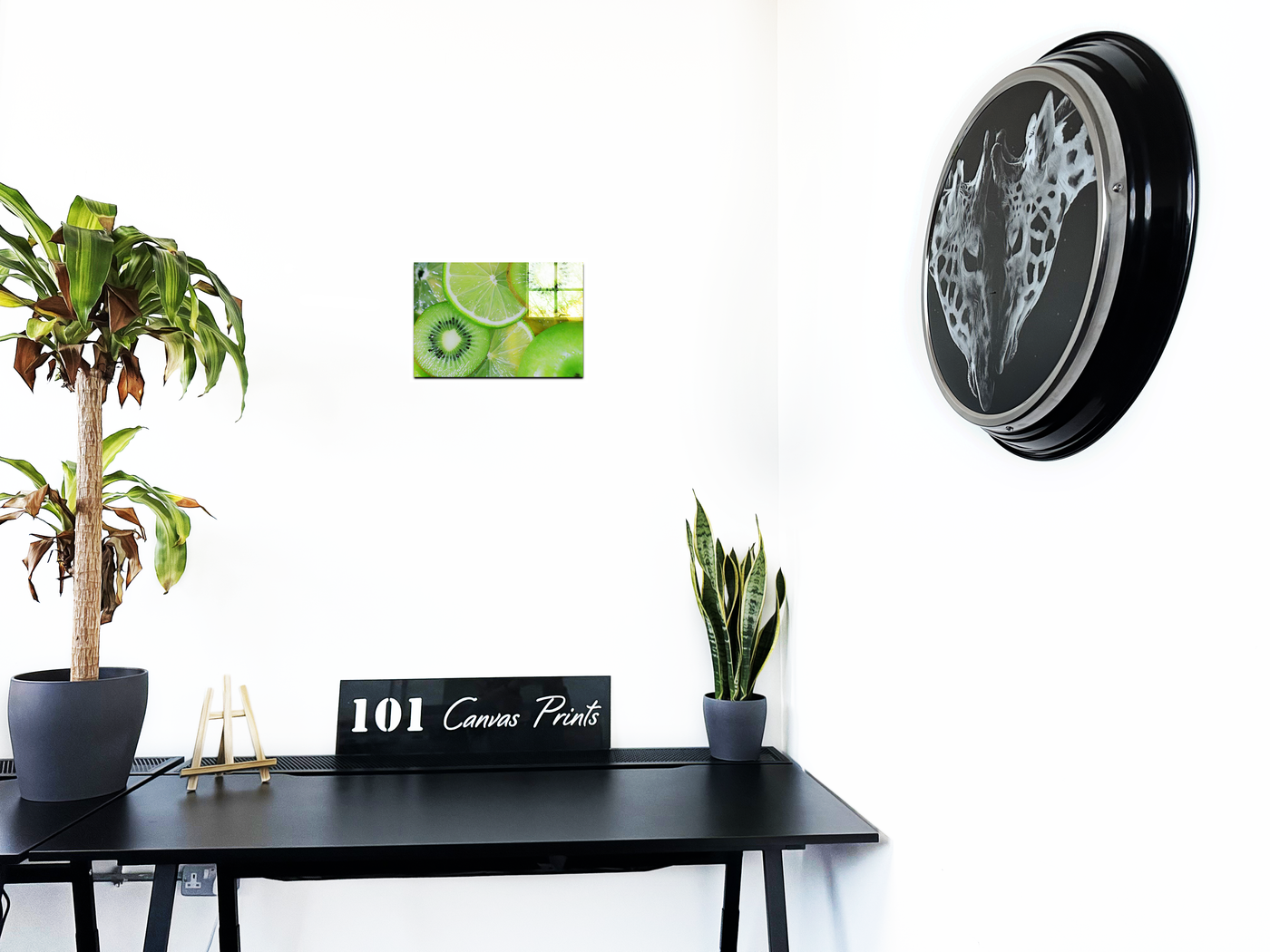 Experience a burst of refreshing greens with this striking acrylic-set print from 101 Canvas Prints. Our expert photography team has captured an intimate portrait of kiwi, apple and lime slices showcasing nature's intricate designs in vivid detail. The image presents a mesmerising close-up of a kiwi's delicate flesh, its tiny black seeds forming a perfect spiral, juxtaposed with the sharp, translucent segments of lime.