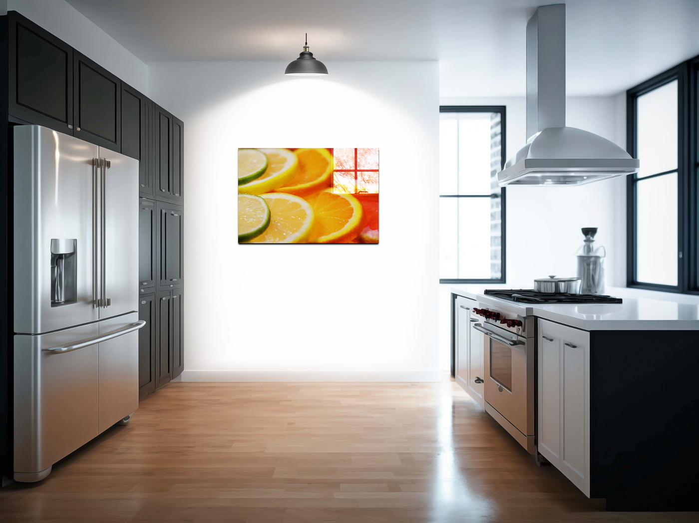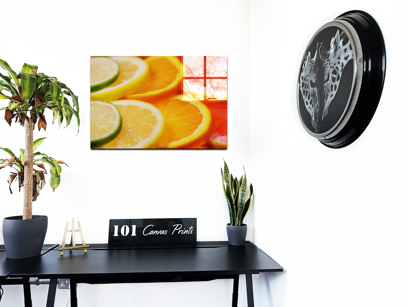 Infuse your space with a burst of freshness with this vivid close-up of citrus fruits, expertly captured by the 101 Canvas Prints photography team. Juicy slices of lemon, lime, and orange dominate the frame, creating a mouth-watering display of sunny yellows, vibrant greens, and rich oranges. The composition artfully showcases the fruits' translucent flesh and intricate segments, set against a warm, inviting background.