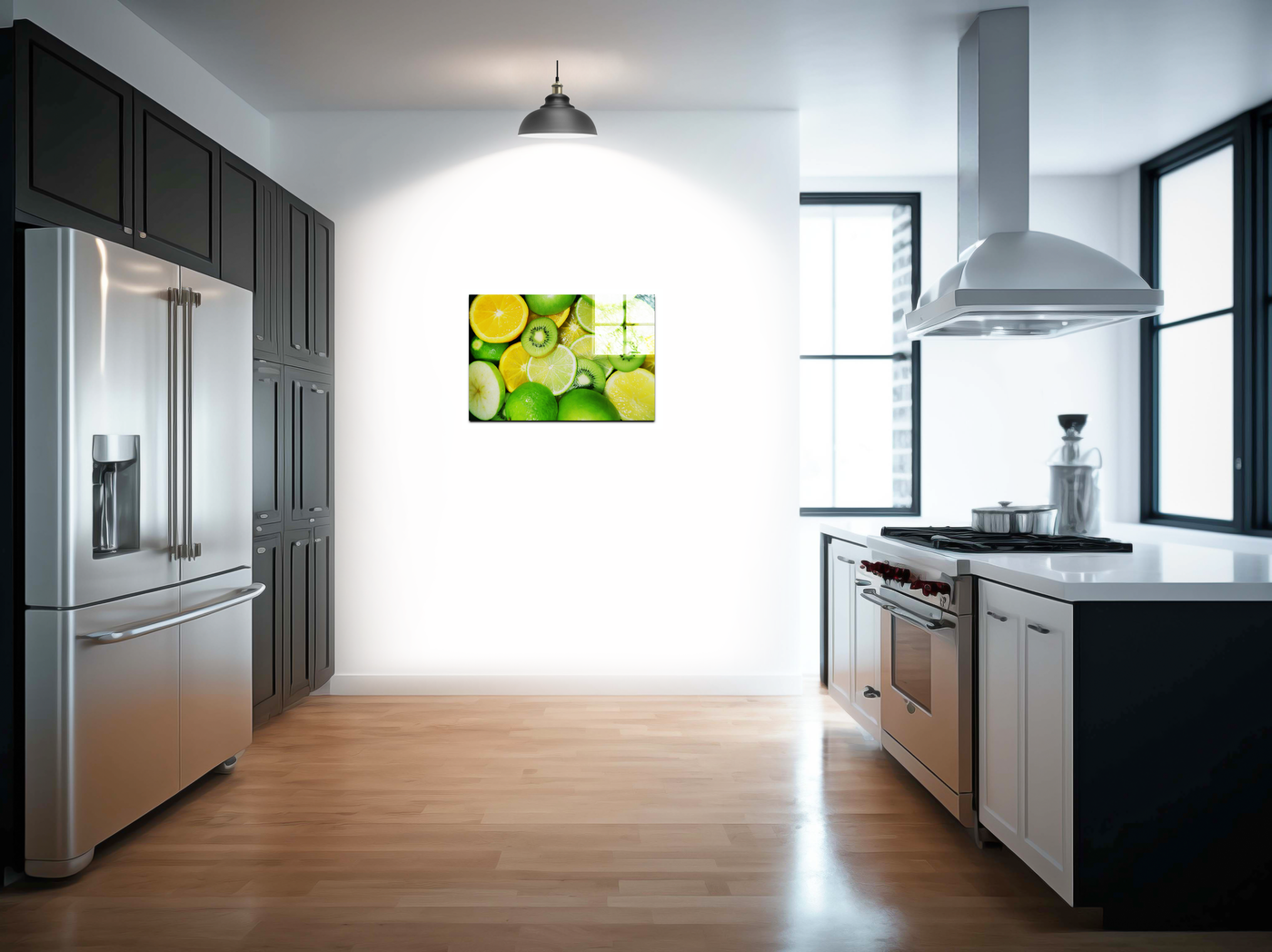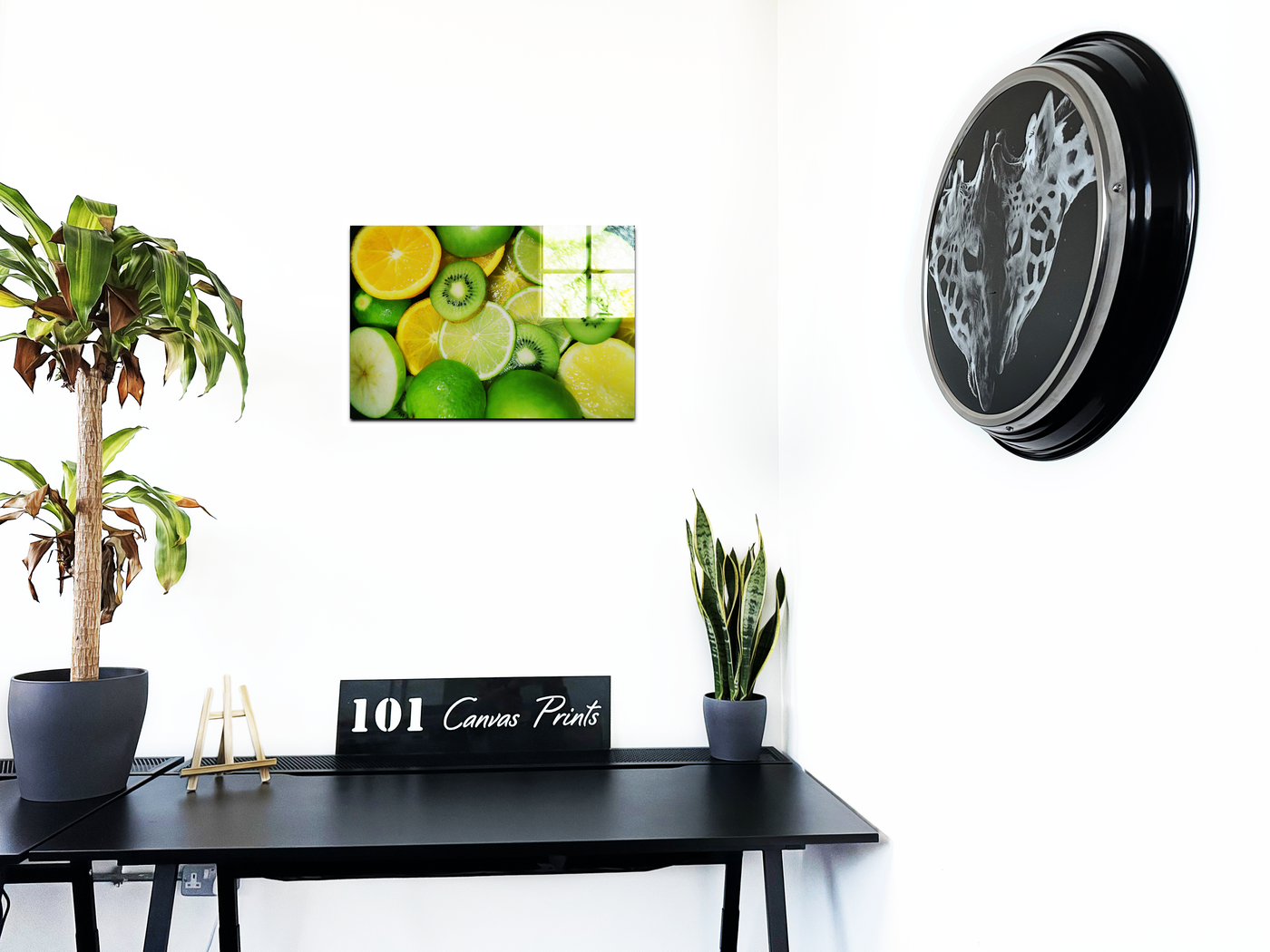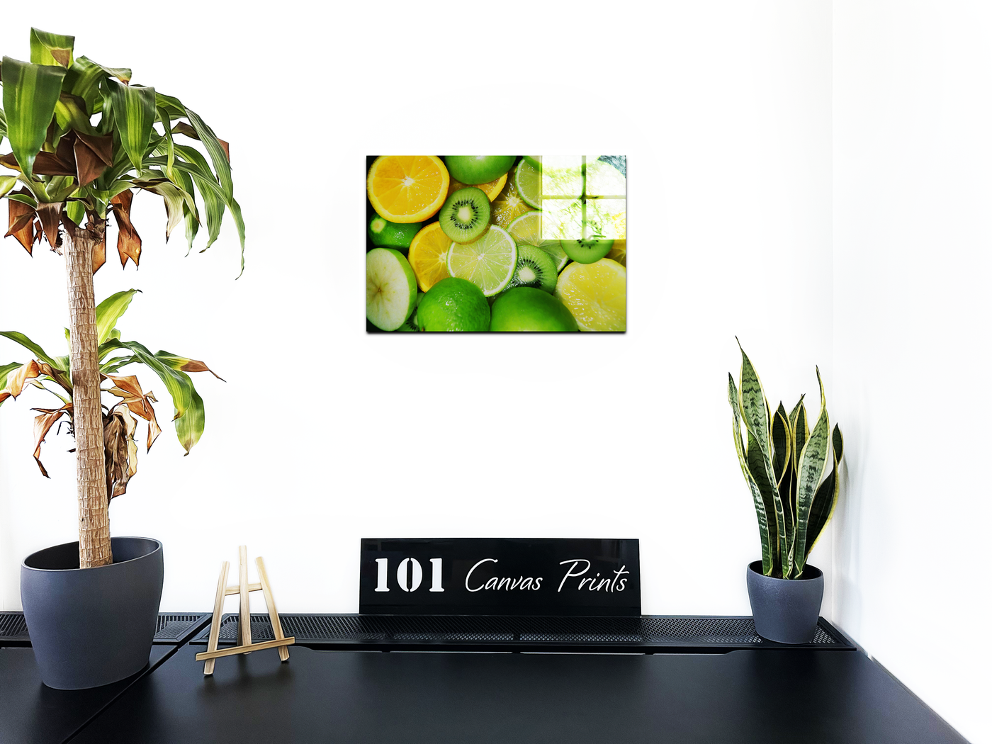 Energize your space with this vibrant close-up of assorted fruits, expertly captured by the 101 Canvas Prints photography team. Lush greens and sunny yellows dominate the frame, showcasing a medley of sliced limes, lemons, kiwis, and green apples. The composition creates a striking mosaic of circular shapes and varied textures, from the intricate segments of citrus to the delicate seeds of kiwi.