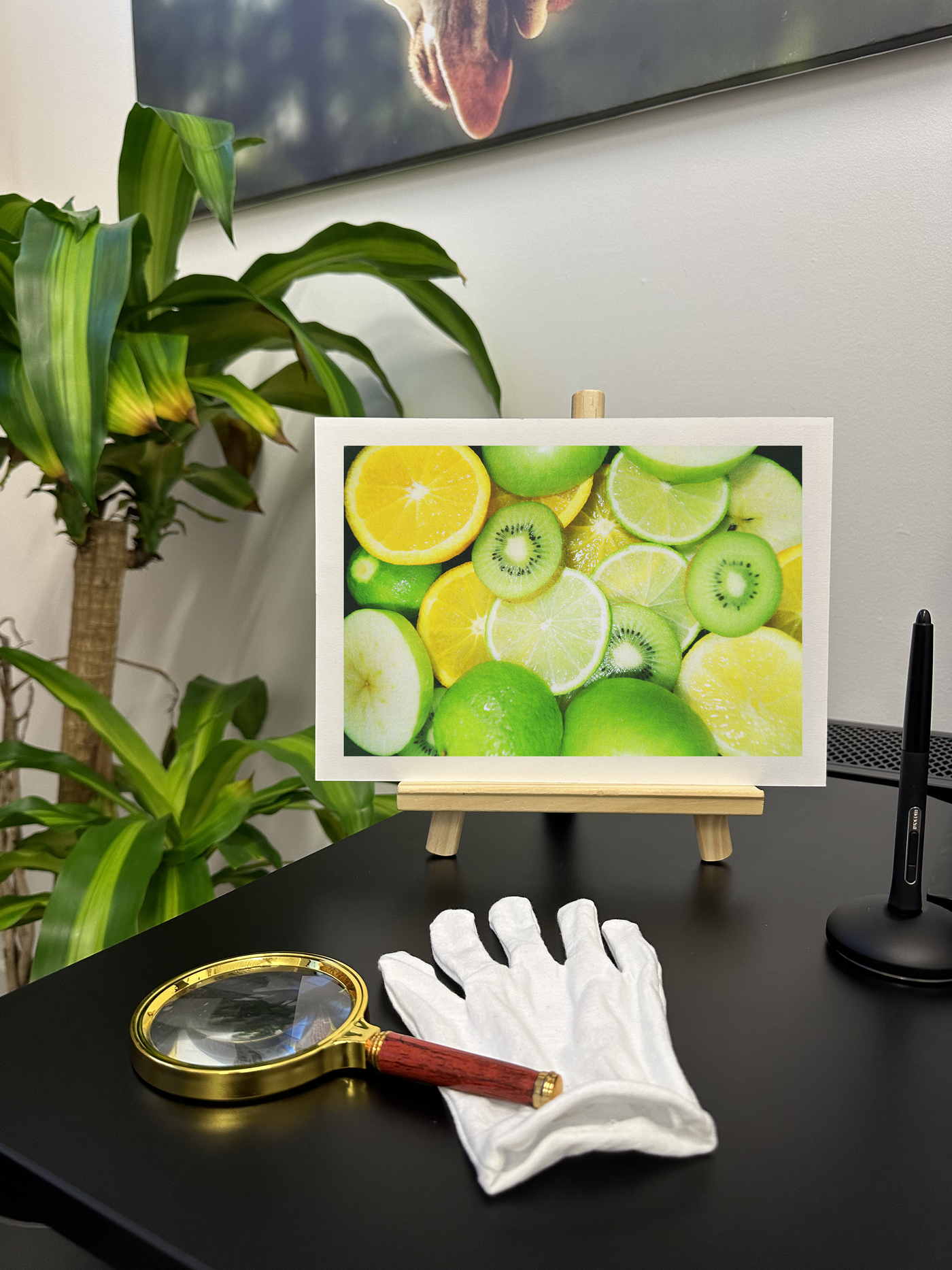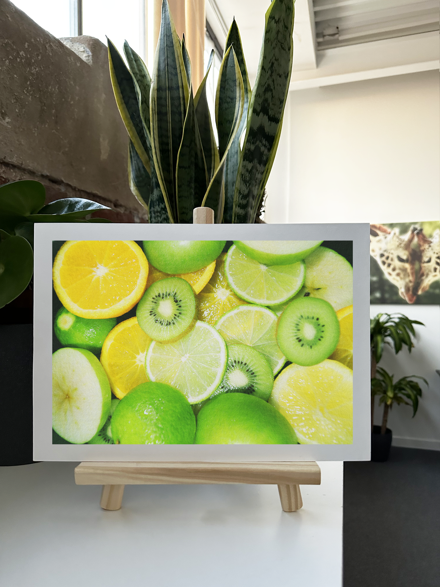 Printed on high-quality Fine Art print paper, this image takes on a natural, tactile quality that complements its subject matter. The texture subtly enhances the fruits' juicy appearance, while the matte finish brings out the richness of the green and yellow hues. This Fine Art print instantly adds a fresh, invigorating touch to your kitchen, dining room, or any area that could benefit from a pop of natural colour and energy.