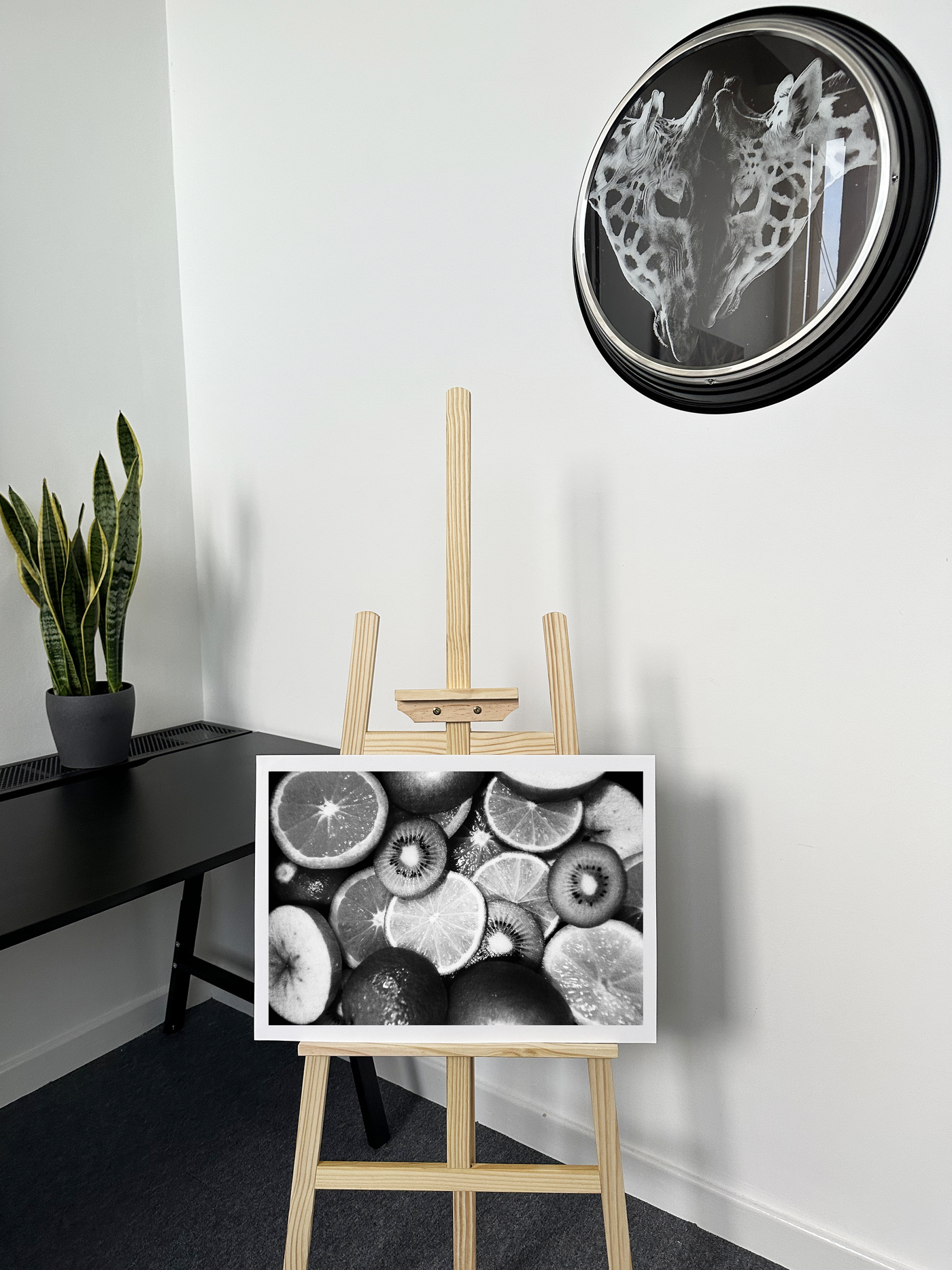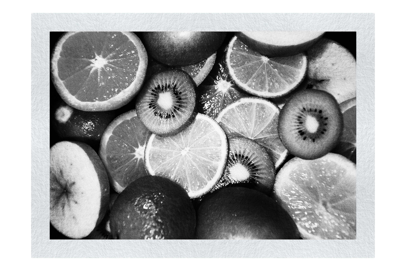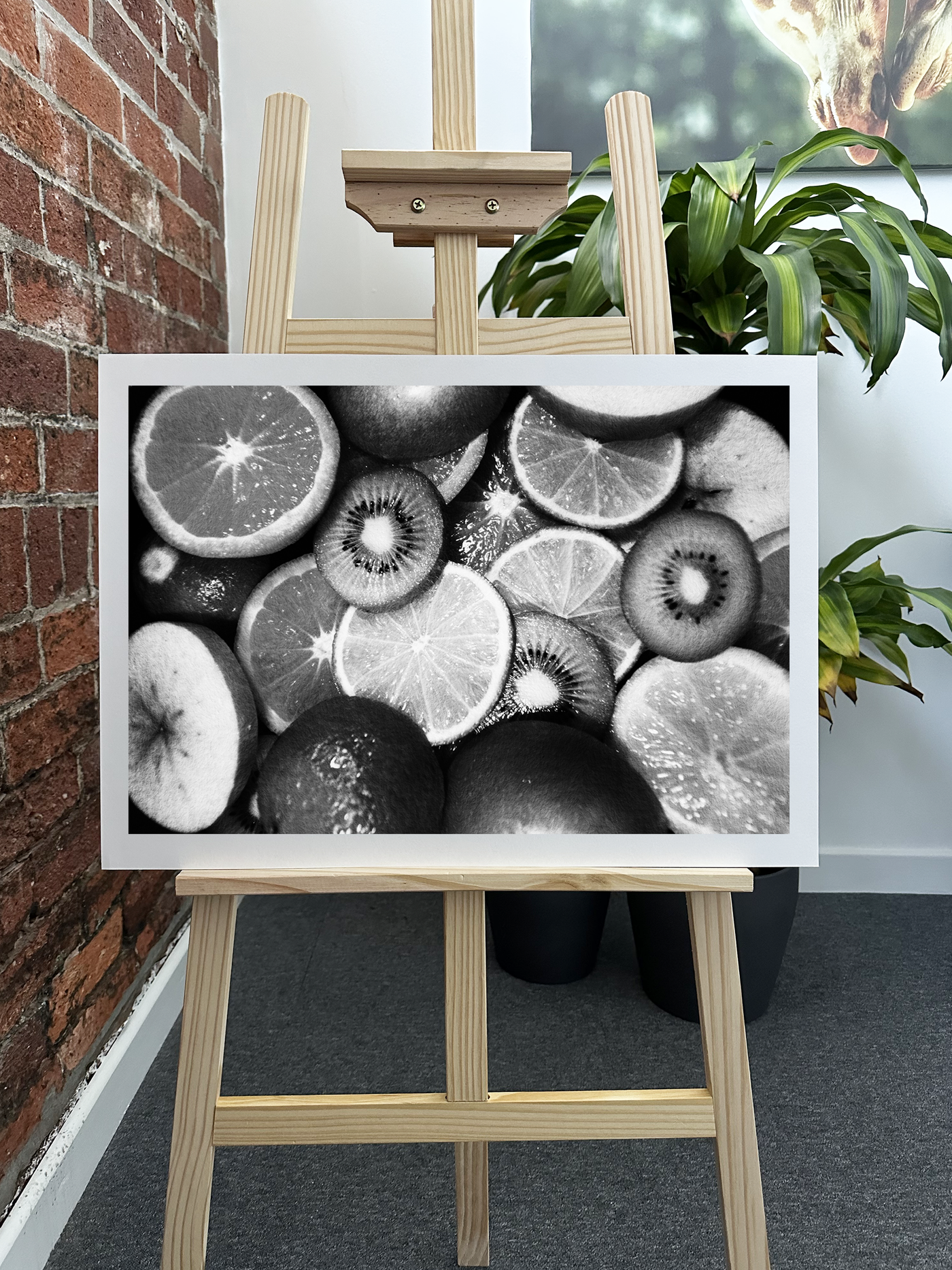 Printed on high-quality Fine Art print paper, this image takes on a natural, tactile quality that complements its subject matter. The texture subtly enhances the fruits' juicy appearance, while the matte finish brings out the richness of the silvery hues. This Monochrome Fine Art print will instantly add a fresh, invigorating touch to your kitchen, dining room, or any area that could benefit from a pop of natural colour and energy.