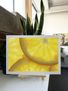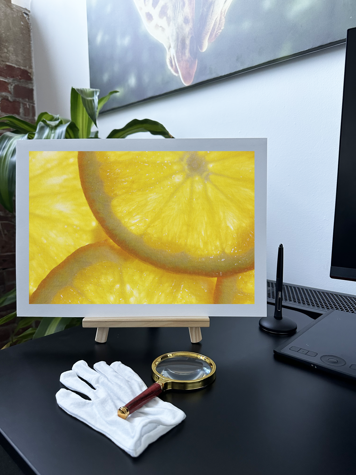 On Fine Art paper, this image takes on a wonderfully tactile quality. The matte finish of the Fine Art paper softens the bright yellows slightly, creating a warm, inviting feel that complements the natural subject matter. The texture of the Fine Art paper subtly enhances the perceived texture of the orange slices, making them appear even more succulent and real. This Fine Art print would be a perfect addition to a kitchen or dining area, bringing a burst of refreshing energy and colour. It could also serve as an uplifting piece in a home office or sunroom, evoking feelings of vitality and zest for life.