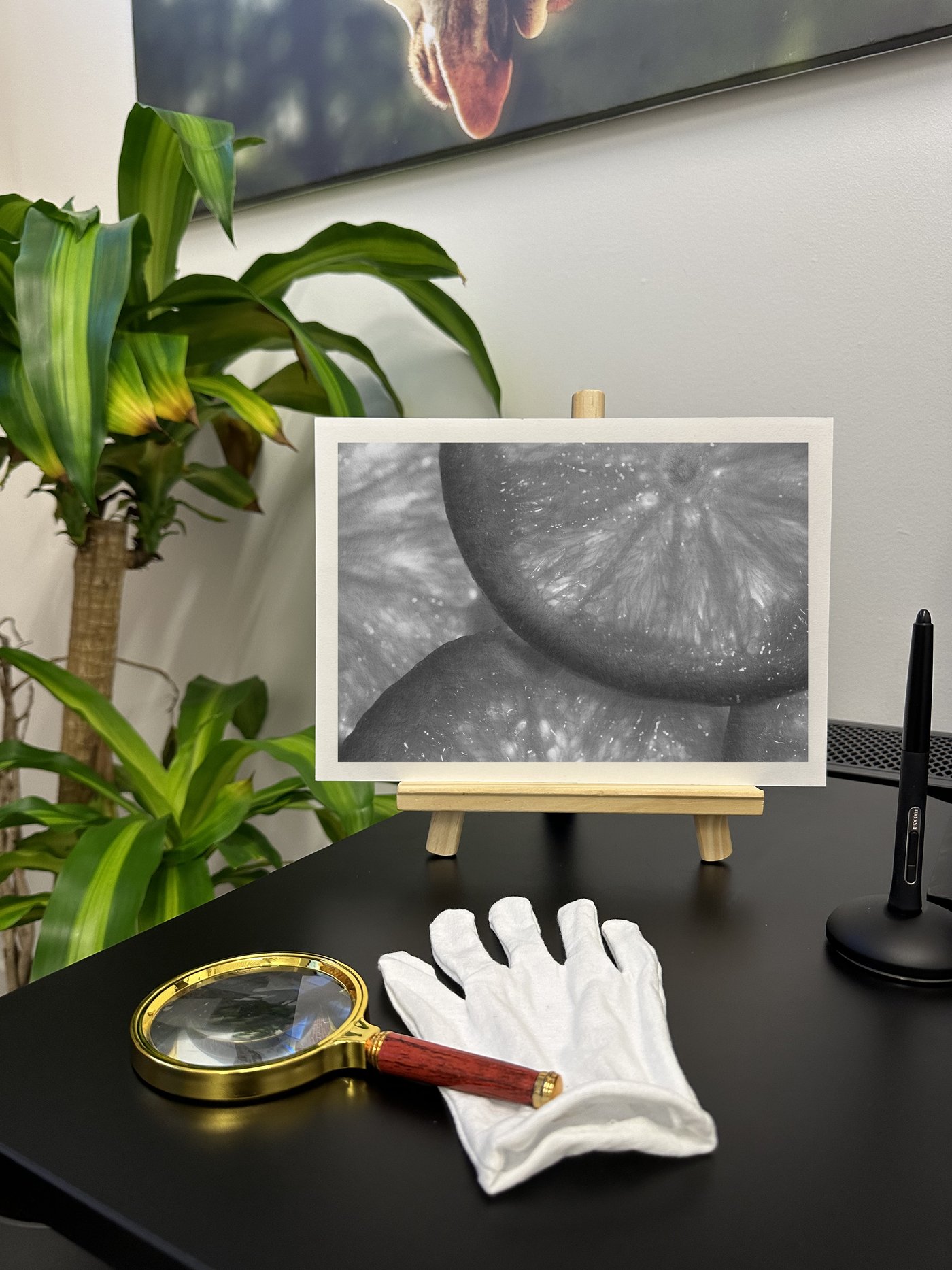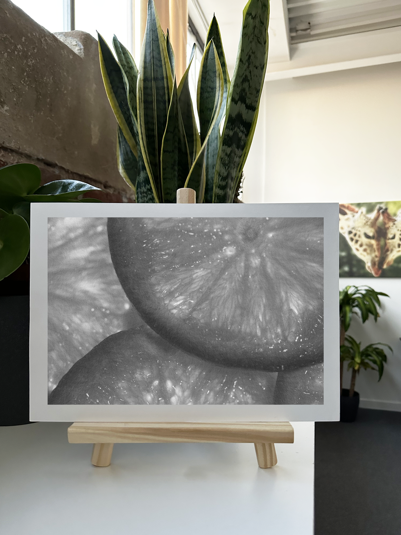 On Fine Art paper, this image takes on a wonderfully tactile quality. The matte finish of the Fine Art paper softens the bright silvery tones slightly, creating a warm, inviting feel that complements the natural subject matter. The texture of the Fine Art paper subtly enhances the perceived texture of the orange slices, making them appear even more succulent and real. This print would be a perfect addition to a kitchen or dining area, bringing a burst of refreshing energy. It could also serve as an uplifting piece in a home office or sunroom, evoking feelings of vitality and zest for life.