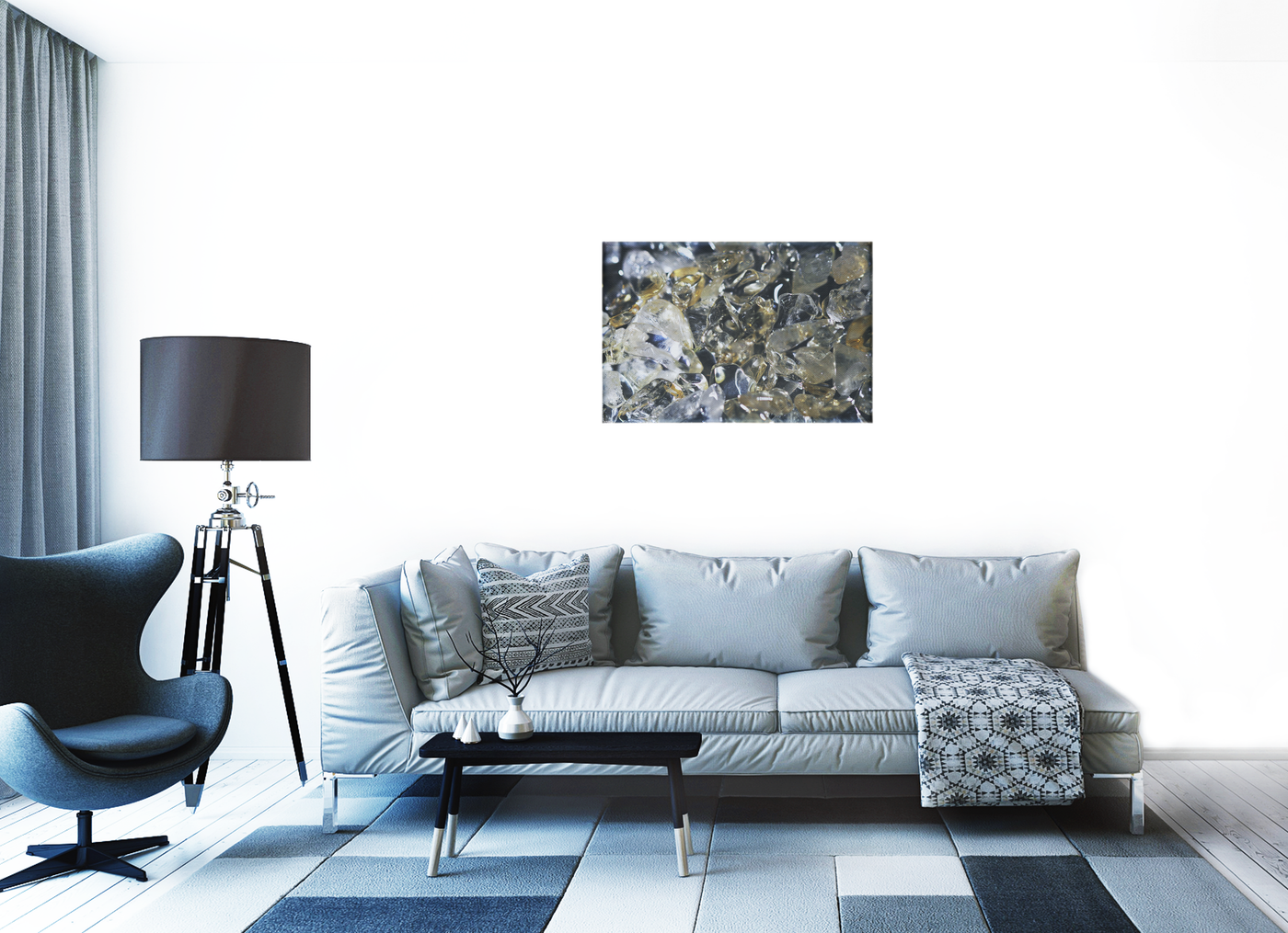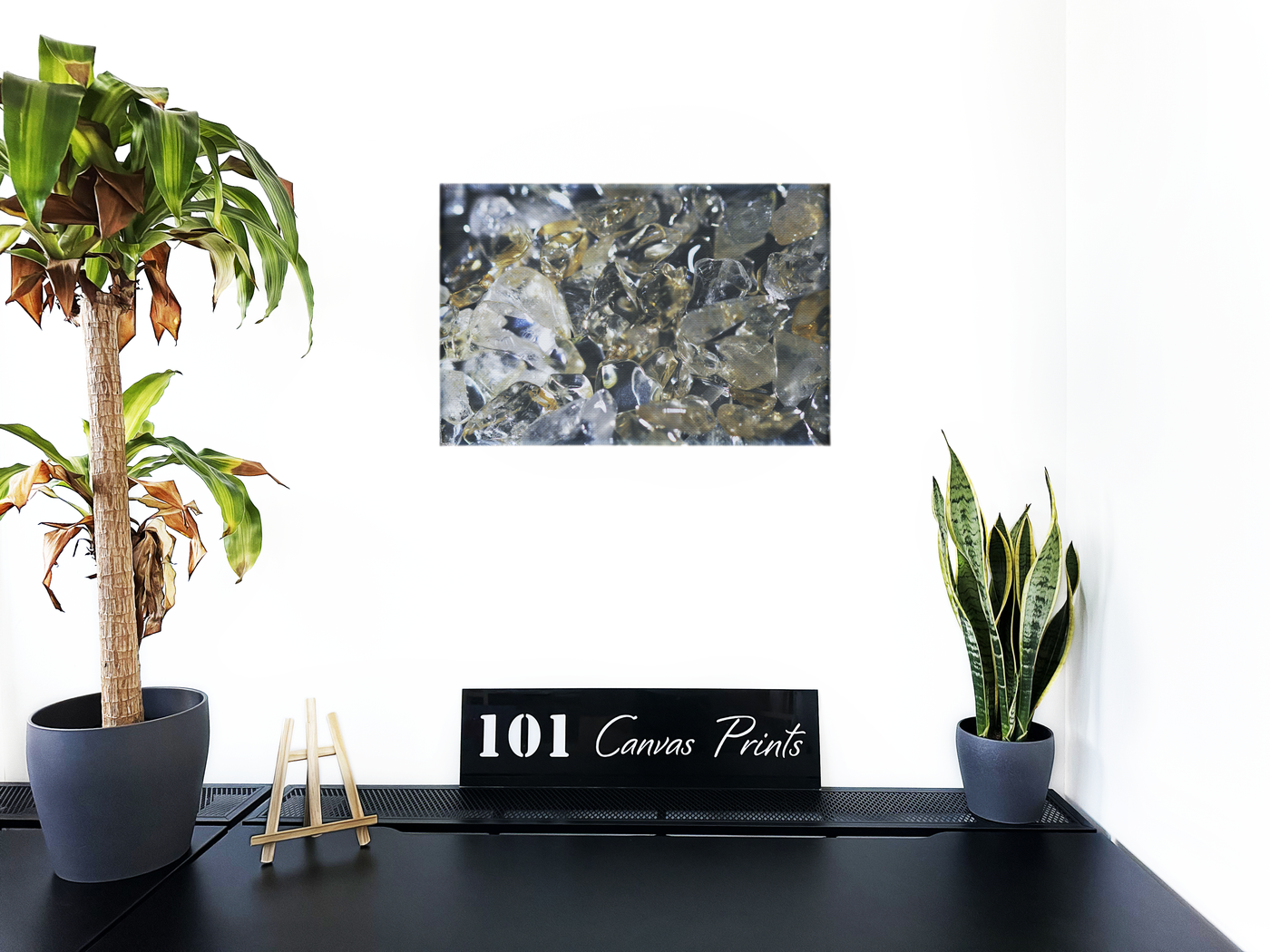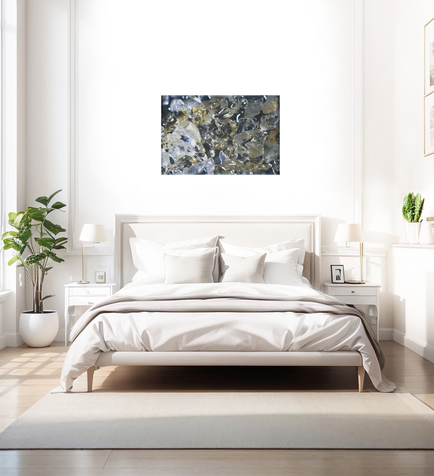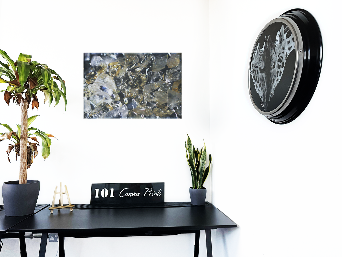 Bring a touch of ethereal beauty into your space with this mesmerising Canvas print from 101 Canvas Prints. Our expert photographers have captured a stunning close-up of crystalline fragments, each shard a miniature prism refracting light in a dazzling display. The Canvas texture subtly softens the sharp edges of the crystals, creating a harmonious blend of form and medium.