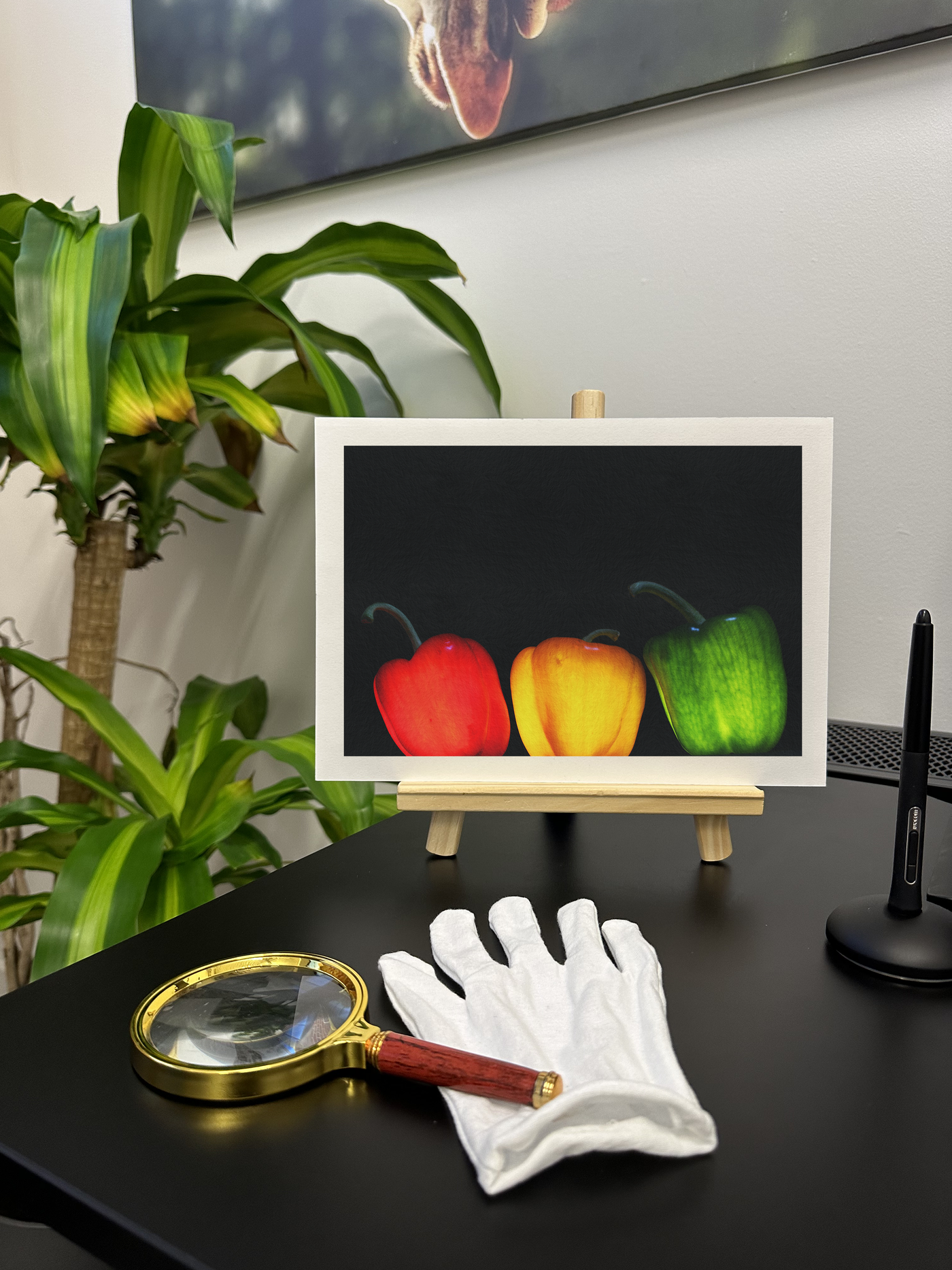 The Fine Art paper texture lends a subtle, painterly quality to the image, softening the peppers' edges and giving the print a timeless, artistic feel. The matte finish of the Fine Art paper reduces glare, allowing you to appreciate the rich colours and subtle details of the peppers from any angle. The interplay between the vibrant subjects and the deep black background creates a dramatic effect that draws the eye and invites closer inspection.