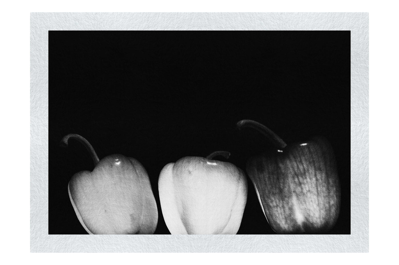The Fine Art paper texture lends a subtle, painterly quality to the image, softening the peppers' edges and giving the print a timeless, artistic feel. The matte finish of the Fine Art paper reduces glare, allowing you to appreciate the rich Monochrome tones and subtle details of the peppers from any angle. The interplay between the vibrant subjects and the deep black background creates a dramatic effect that draws the eye and invites closer inspection.