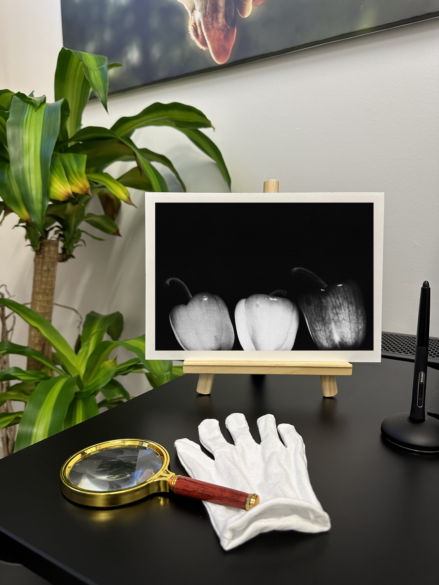 The Fine Art paper texture lends a subtle, painterly quality to the image, softening the peppers' edges and giving the print a timeless, artistic feel. The matte finish of the Fine Art paper reduces glare, allowing you to appreciate the rich Monochrome tones and subtle details of the peppers from any angle. The interplay between the vibrant subjects and the deep black background creates a dramatic effect that draws the eye and invites closer inspection.