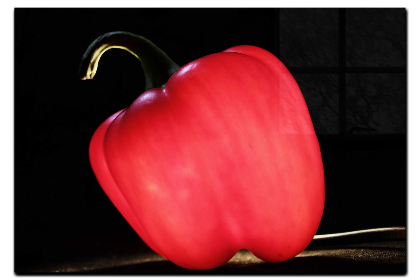 The photographer's mastery of light brings out the extraordinary richness of the pepper's red colouring, creating an almost luminous quality against the deep black background. Through our precise photography and print enhancement process, we've maintained every subtle variation in tone and texture, from the bright highlights to the deeper shadows that define the pepper's distinctive shape. The result is an image that celebrates the natural beauty of this common vegetable with uncommon artistry.