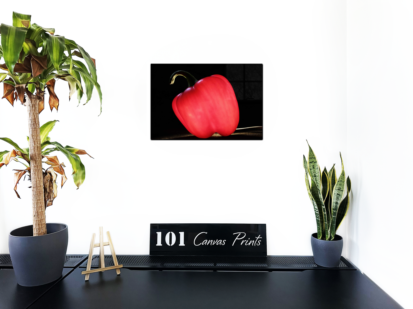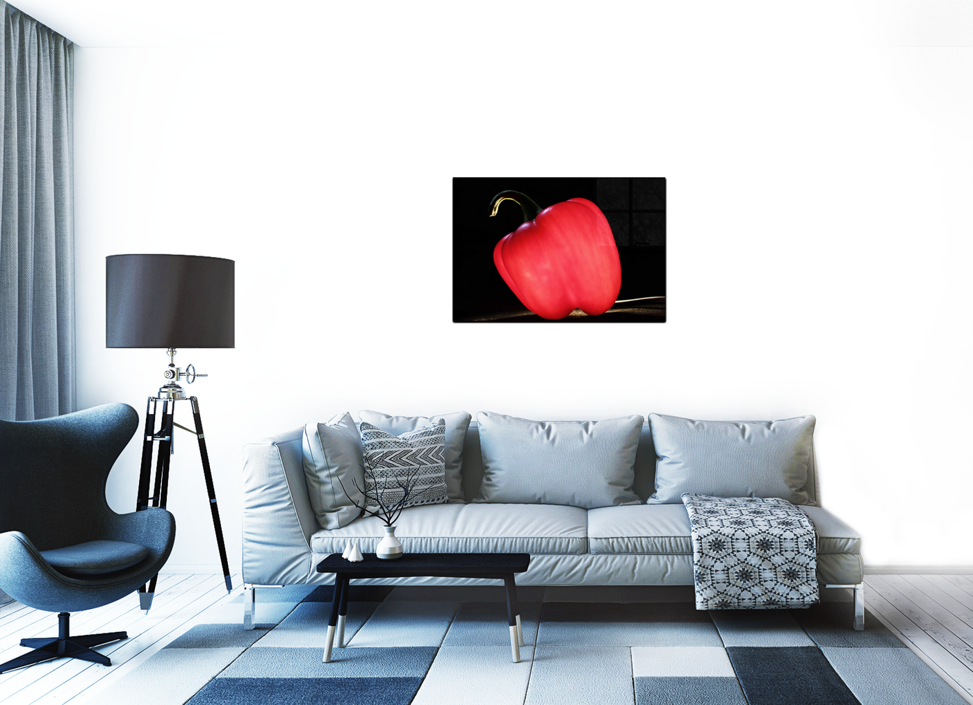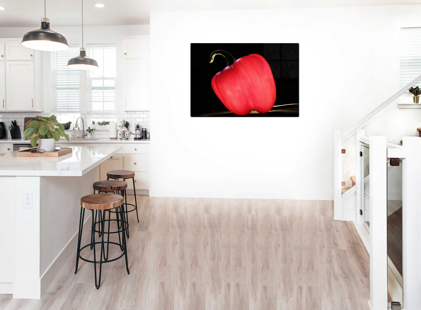 When presented in our premium Acrylic medium, this study achieves an extraordinary level of visual impact. The high-gloss finish dramatically enhances the pepper's natural sheen, while the crystal-clear surface creates an almost three-dimensional effect that makes the subject appear to float in space. The way light interacts with our Acrylic prints adds an extra dimension to the viewing experience, emphasising both the pepper's vibrant colour and its sculptural form. This stunning piece would be particularly effective in contemporary kitchens or dining spaces, where its dramatic presence can elevate everyday cooking into an art form, reminding viewers of the beauty in simple, natural forms.