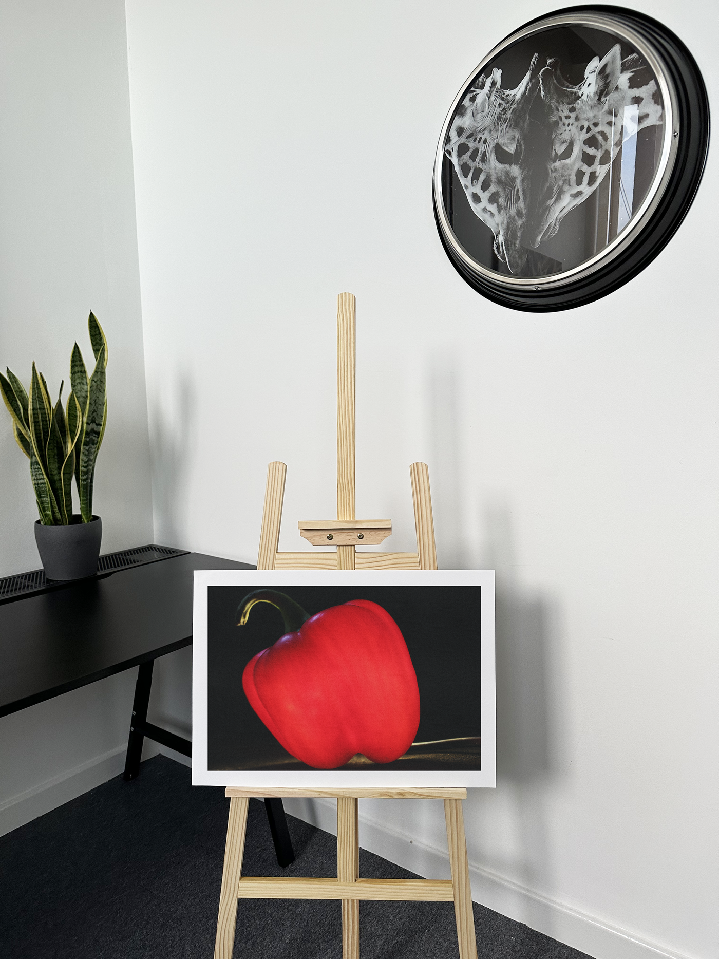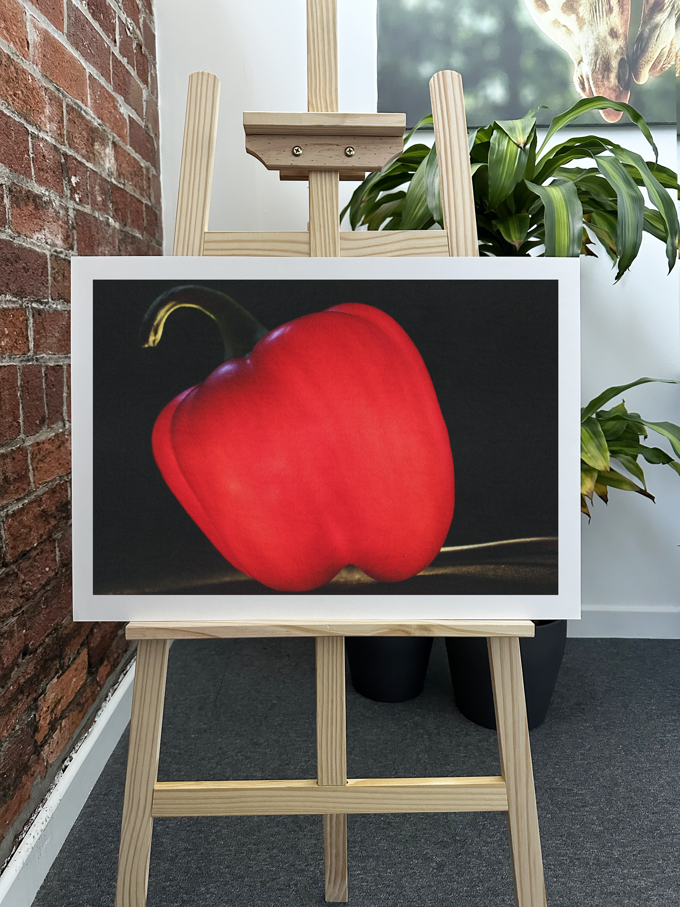 Reproduced on our premium Fine Art paper material, this contemporary still life takes on an additional layer of artistic sophistication. The natural, matte finish of the Fine Art paper provides a beautiful contrast to the pepper's natural surface, creating a perfect balance between medium and subject. This piece would make a striking addition to any modern kitchen or dining space, where its bold simplicity and dramatic presentation can transform an everyday vegetable into a conversation piece about the beauty found in simple things.