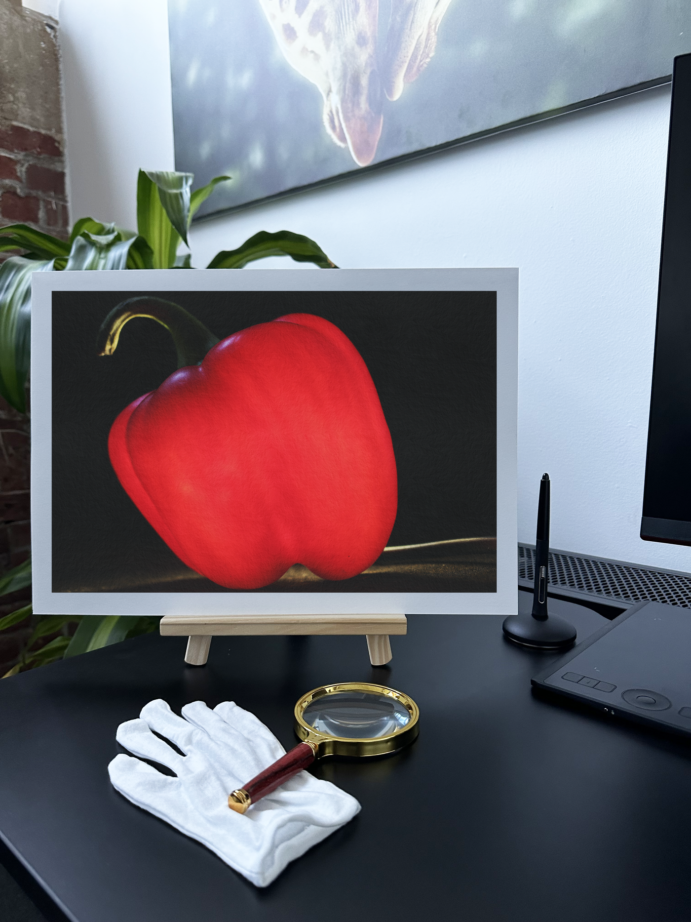Reproduced on our premium Fine Art paper material, this contemporary still life takes on an additional layer of artistic sophistication. The natural, matte finish of the Fine Art paper provides a beautiful contrast to the pepper's natural surface, creating a perfect balance between medium and subject. This piece would make a striking addition to any modern kitchen or dining space, where its bold simplicity and dramatic presentation can transform an everyday vegetable into a conversation piece about the beauty found in simple things.