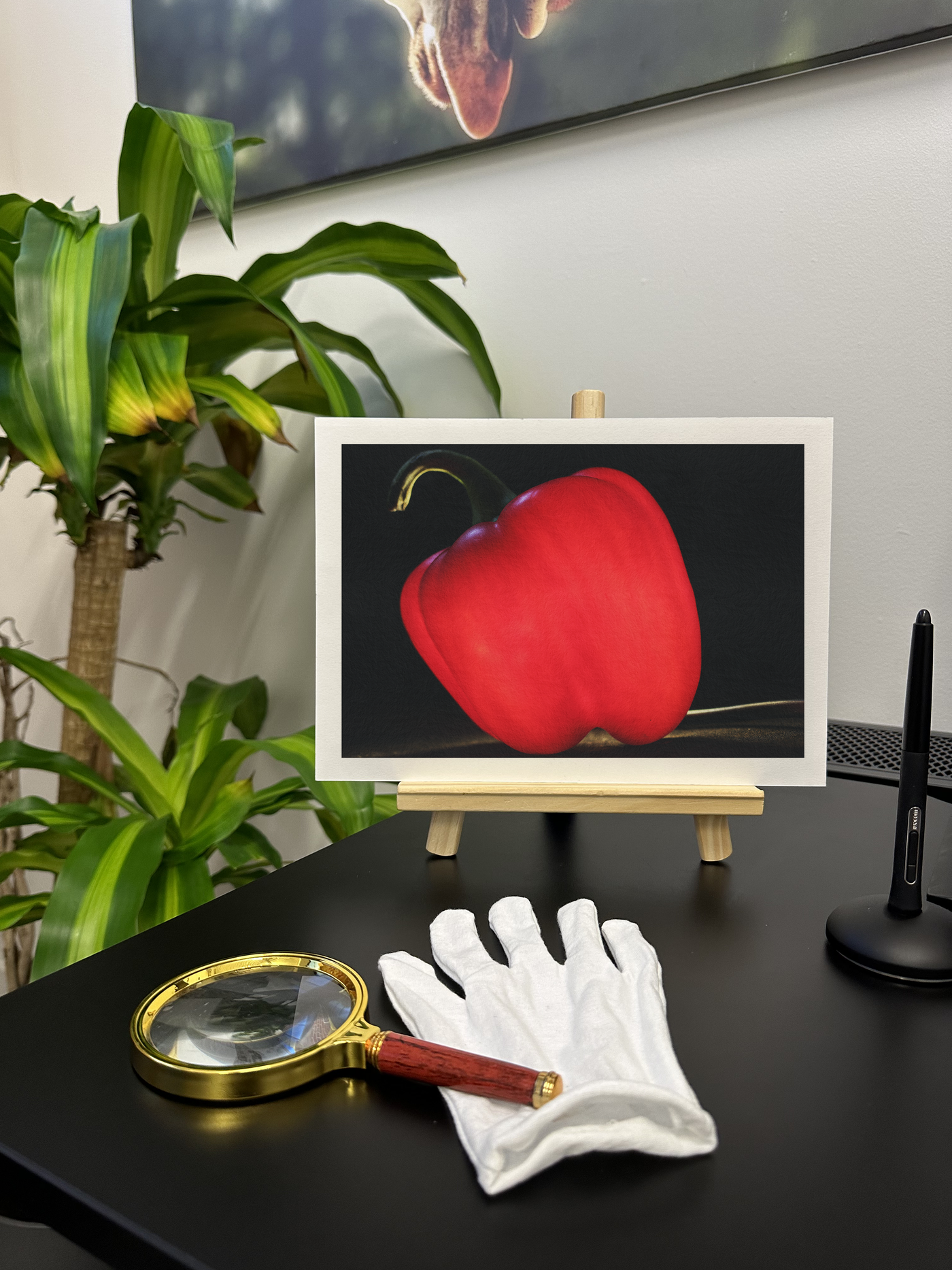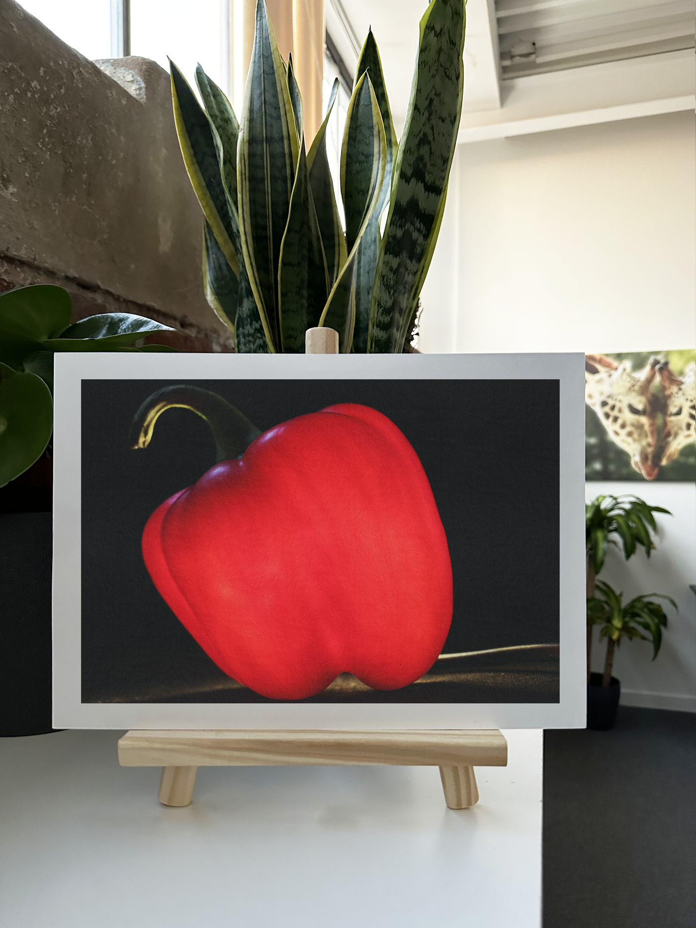 Reproduced on our premium Fine Art paper material, this contemporary still life takes on an additional layer of artistic sophistication. The natural, matte finish of the Fine Art paper provides a beautiful contrast to the pepper's natural surface, creating a perfect balance between medium and subject. This piece would make a striking addition to any modern kitchen or dining space, where its bold simplicity and dramatic presentation can transform an everyday vegetable into a conversation piece about the beauty found in simple things.