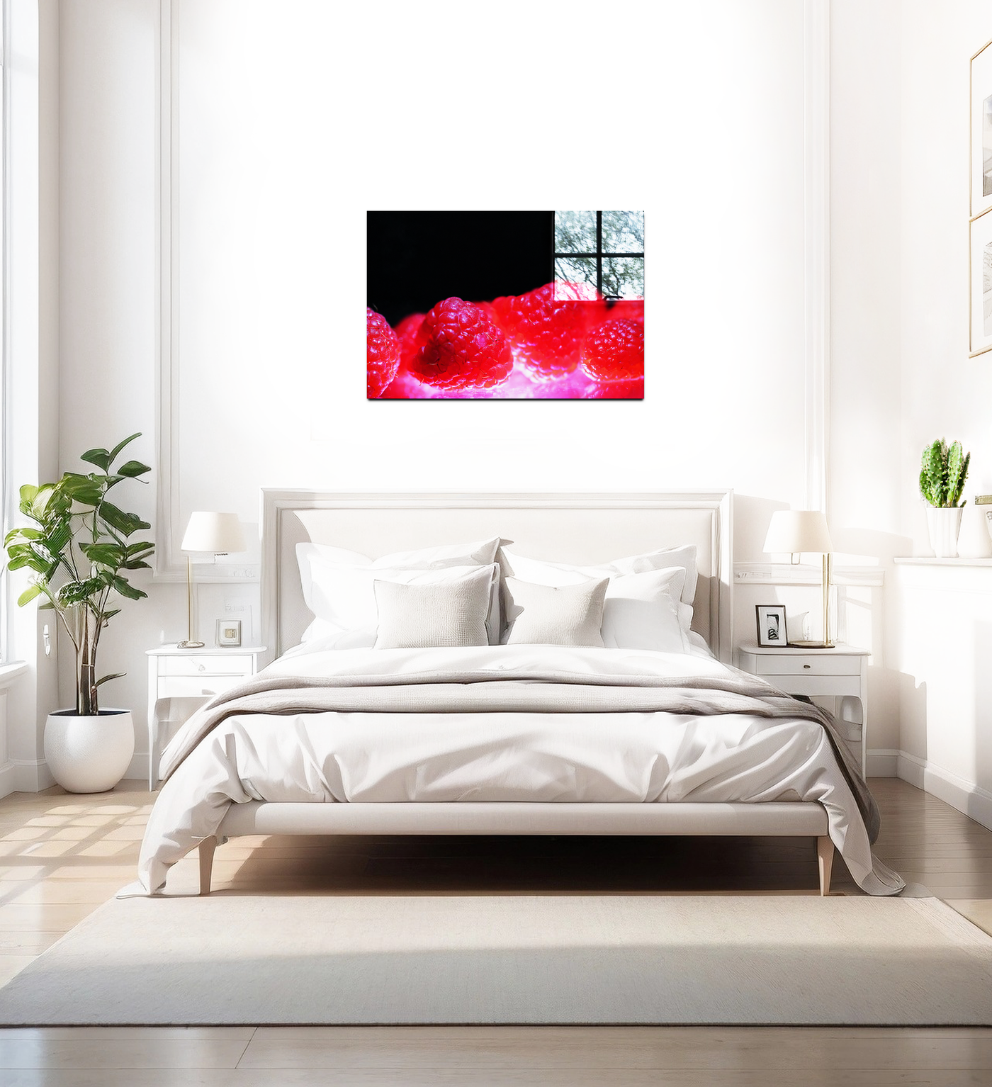 The photographer's mastery of light and colour brings out an extraordinary range of reds, from brilliant scarlet to deep crimson, with subtle pink undertones adding depth and dimension. Through our precise photography and print enhancement process, we've maintained every nuance of texture and tone, from the gentle curves of each drupelet to the way light catches and reflects off the berries' naturally glossy surface. The result is an image that appears almost three-dimensional in its detail and depth.