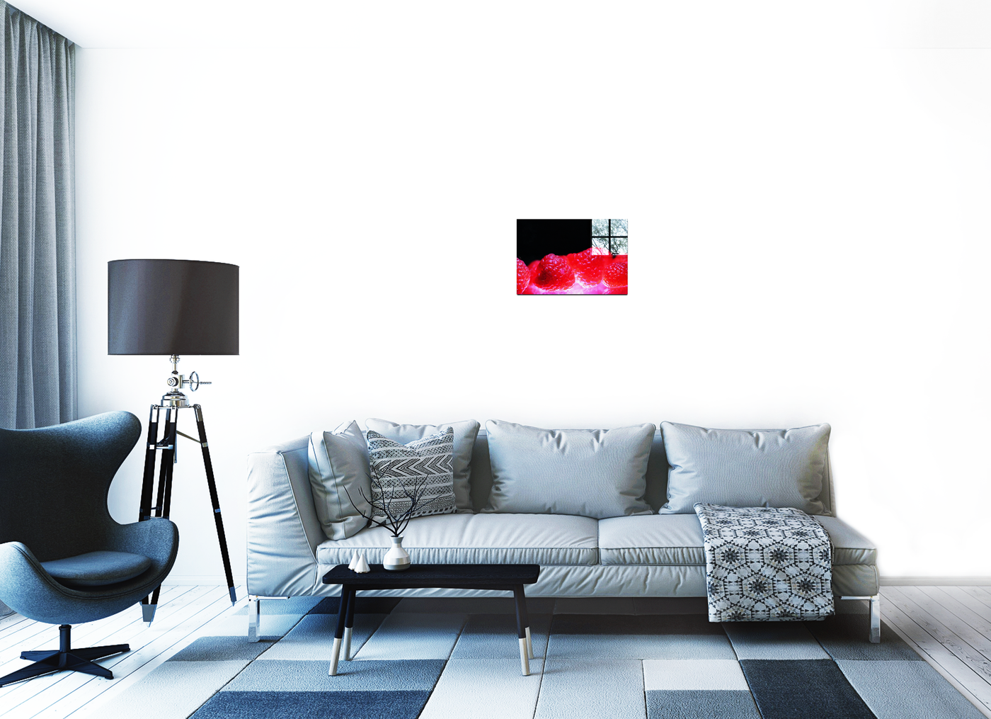 The photographer's mastery of light and colour brings out an extraordinary range of reds, from brilliant scarlet to deep crimson, with subtle pink undertones adding depth and dimension. Through our precise photography and print enhancement process, we've maintained every nuance of texture and tone, from the gentle curves of each drupelet to the way light catches and reflects off the berries' naturally glossy surface. The result is an image that appears almost three-dimensional in its detail and depth.