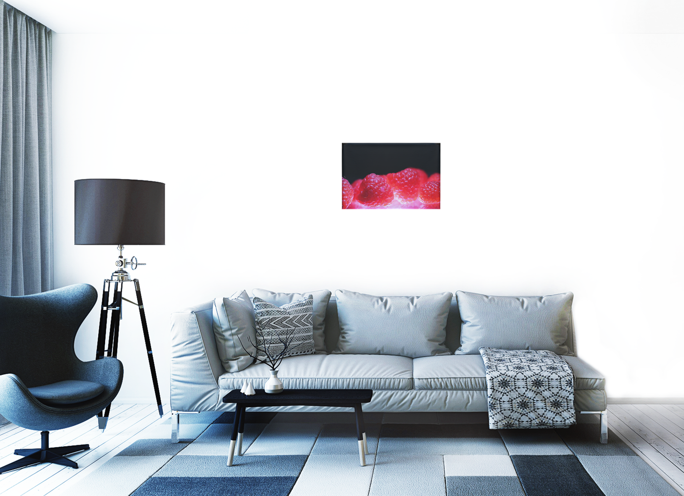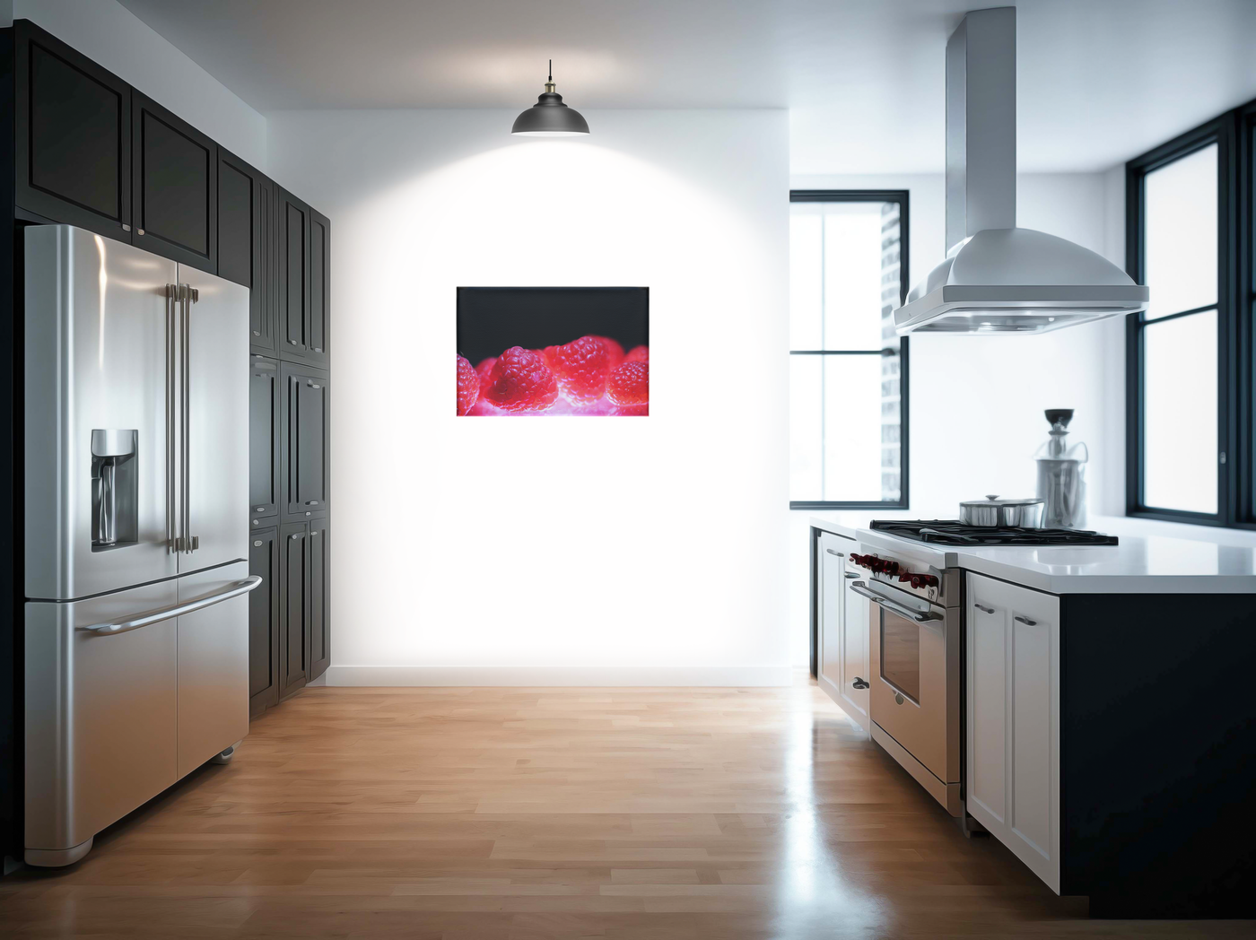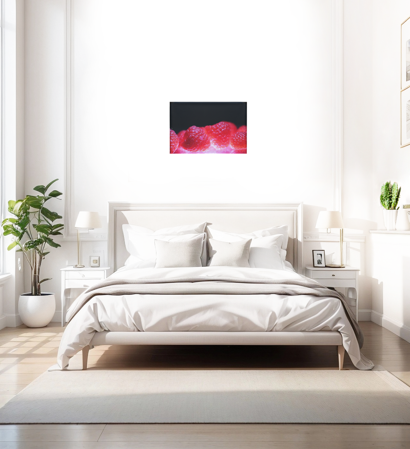 The colour palette is a celebration of red in all its glory, from bright crimson highlights to deep burgundy shadows, with hints of pink undertones adding warmth and dimension. Our print enhancement team have carefully preserved every detail of the berries' complex surface texture, from the individual drupelets to the way light plays across their glossy surface. The contrast between the vibrant fruit and the deep black background creates a dramatic effect that emphasises the berries' natural beauty.