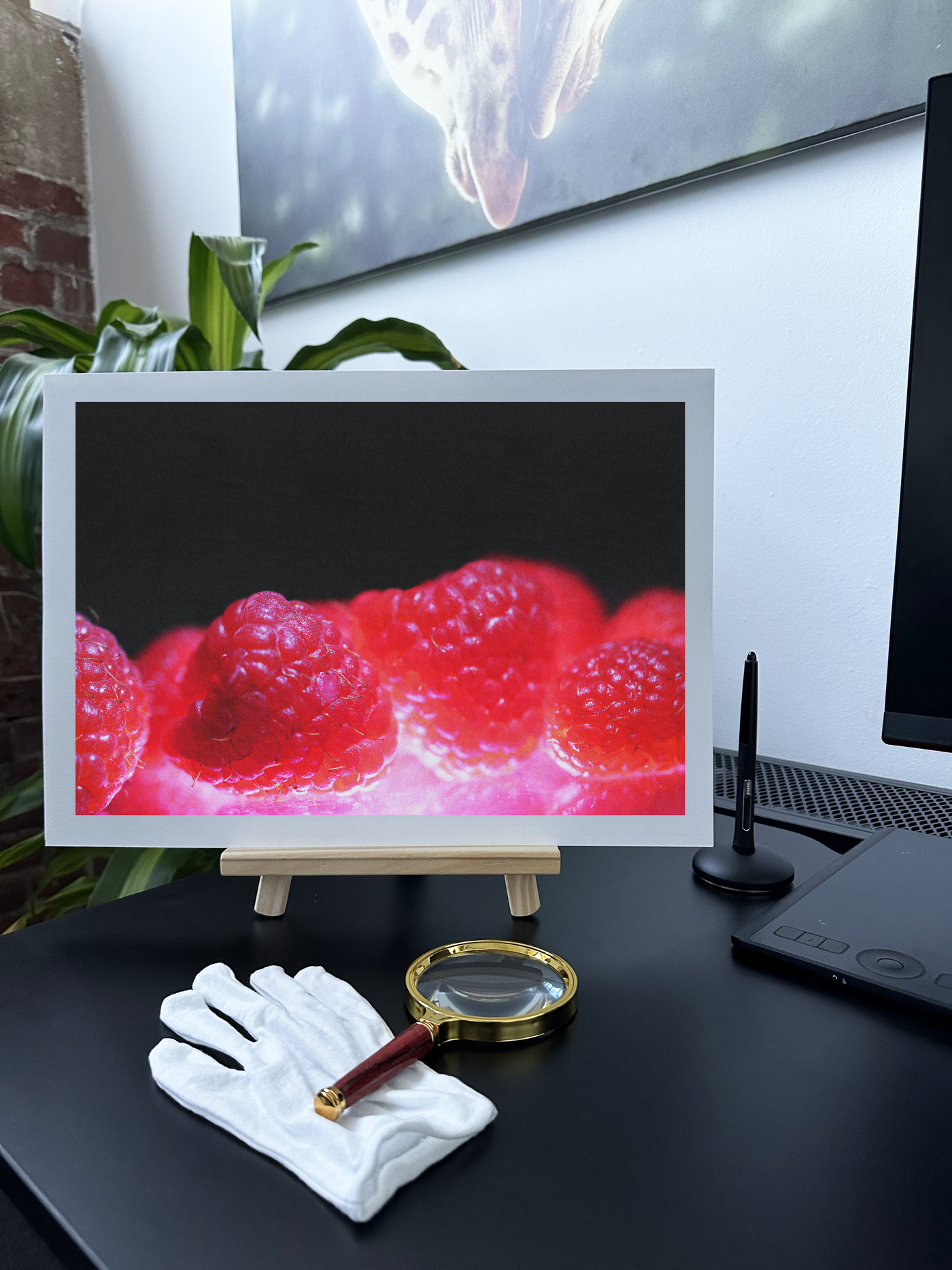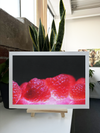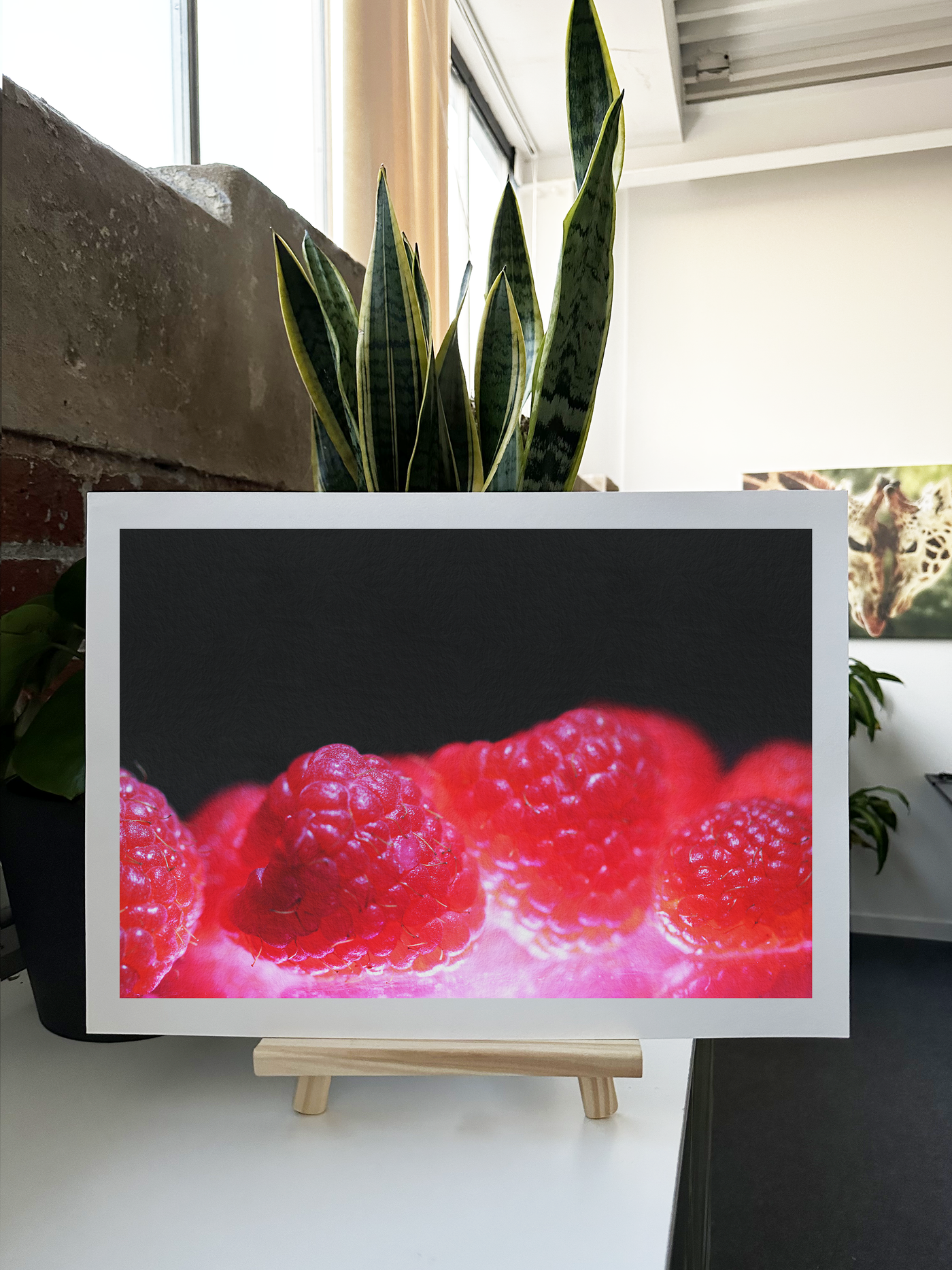 The colour palette is a celebration of red in all its glory, from bright crimson highlights to deep burgundy shadows, with hints of pink undertones adding warmth and dimension. Our print enhancement team have carefully preserved every detail of the berries' complex surface texture, from the individual drupelets to the way light plays across their glossy surface. The contrast between the vibrant fruit and the deep black background creates a dramatic effect that emphasises the berries' natural beauty.