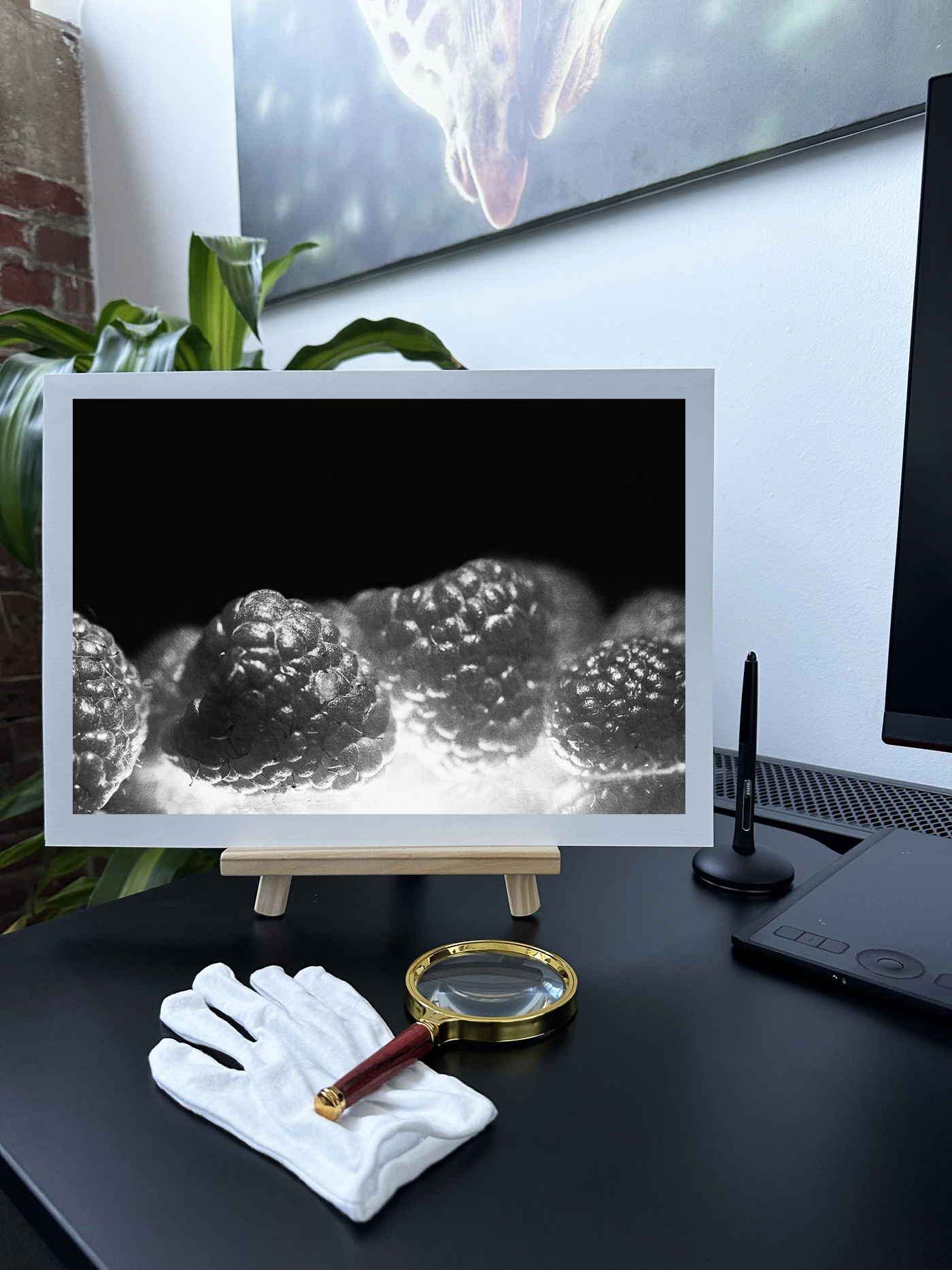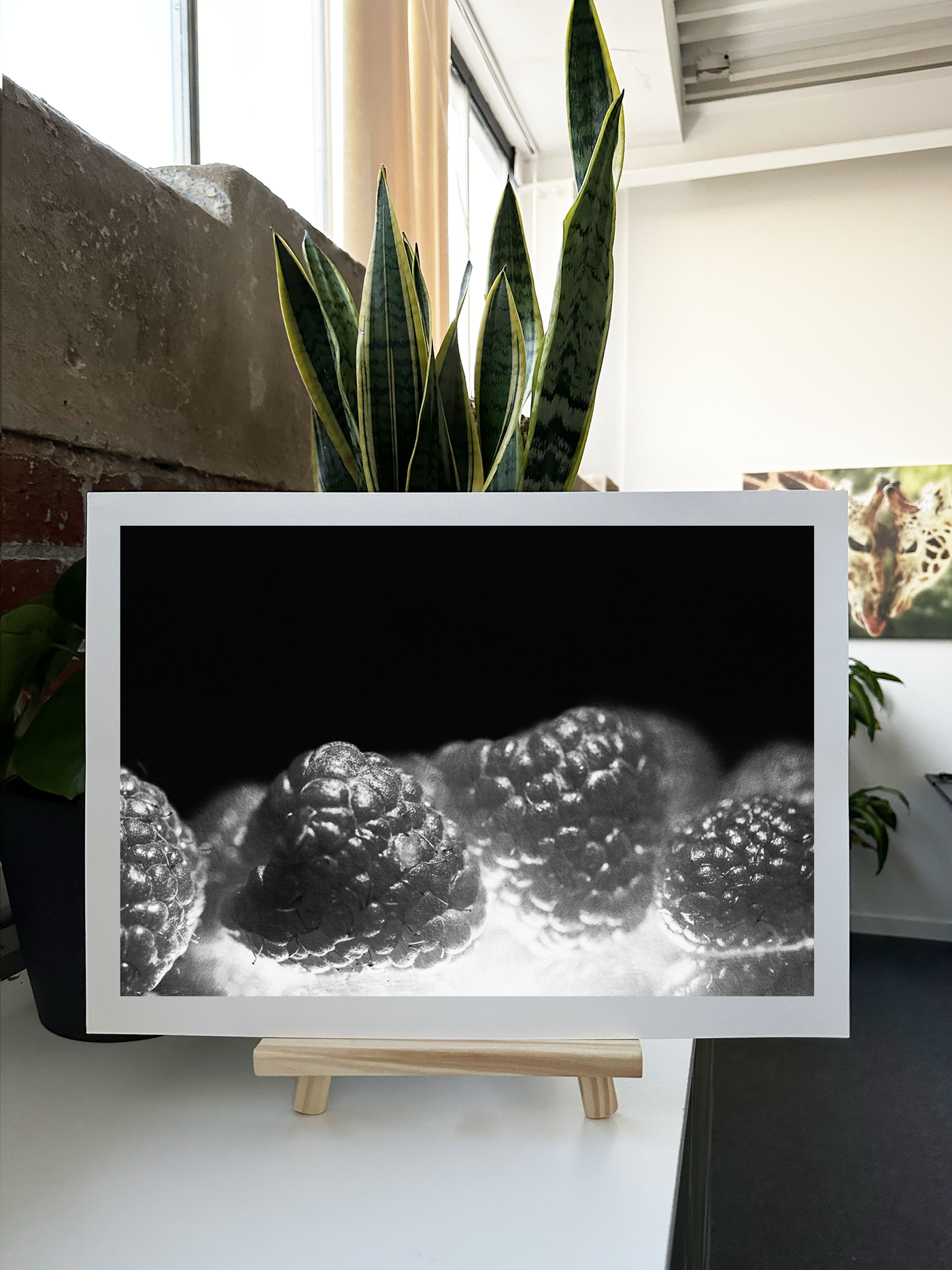 The colour palette is a celebration of Monochrome in all its glory, from bright white highlights to deep grey shadows adding warmth and dimension. Our print enhancement team have carefully preserved every detail of the berries' complex surface texture, from the individual drupelets to the way light plays across their glossy surface. The contrast between the vibrant fruit and the deep black background creates a dramatic effect that emphasises the berries' natural beauty.