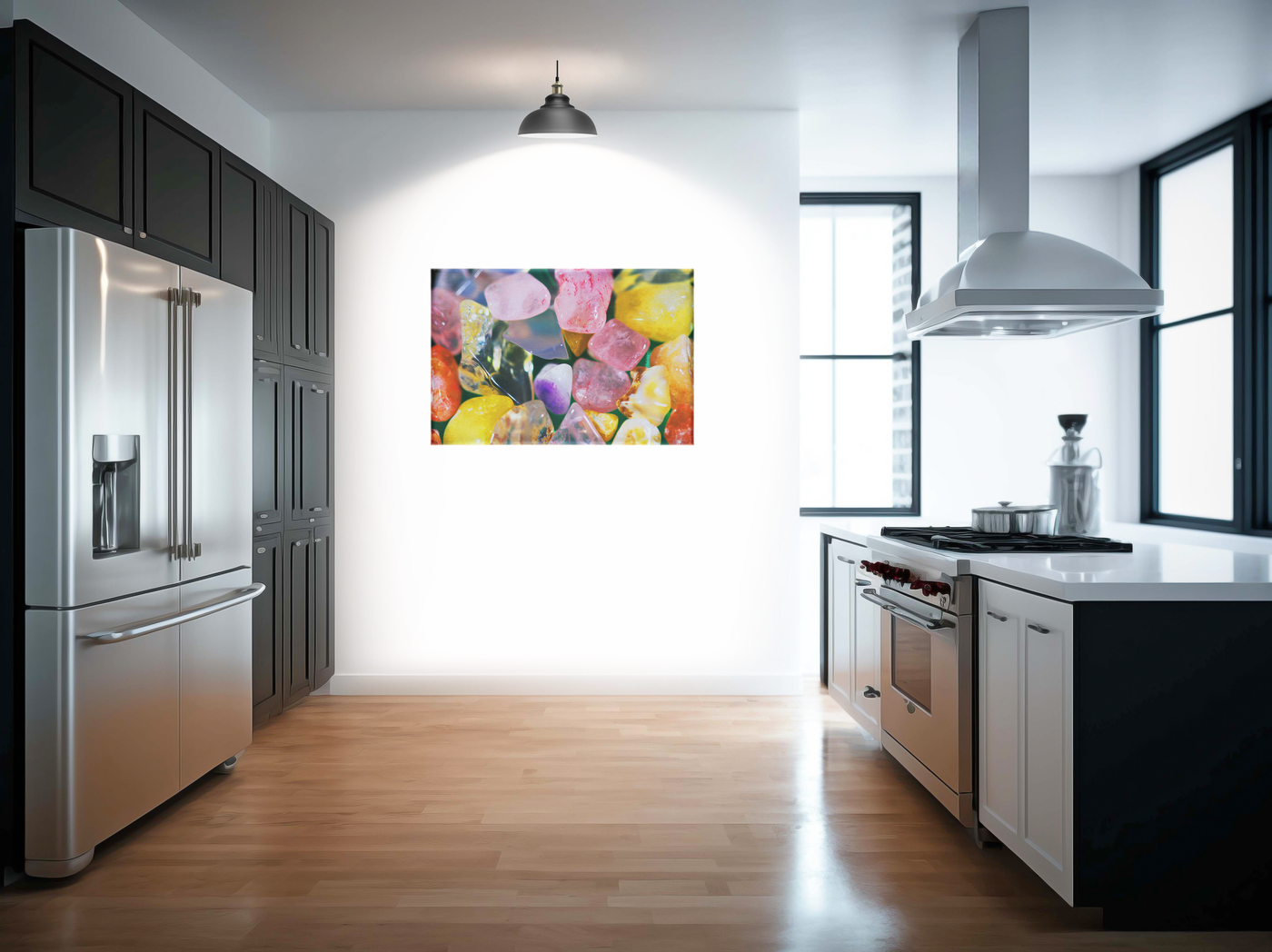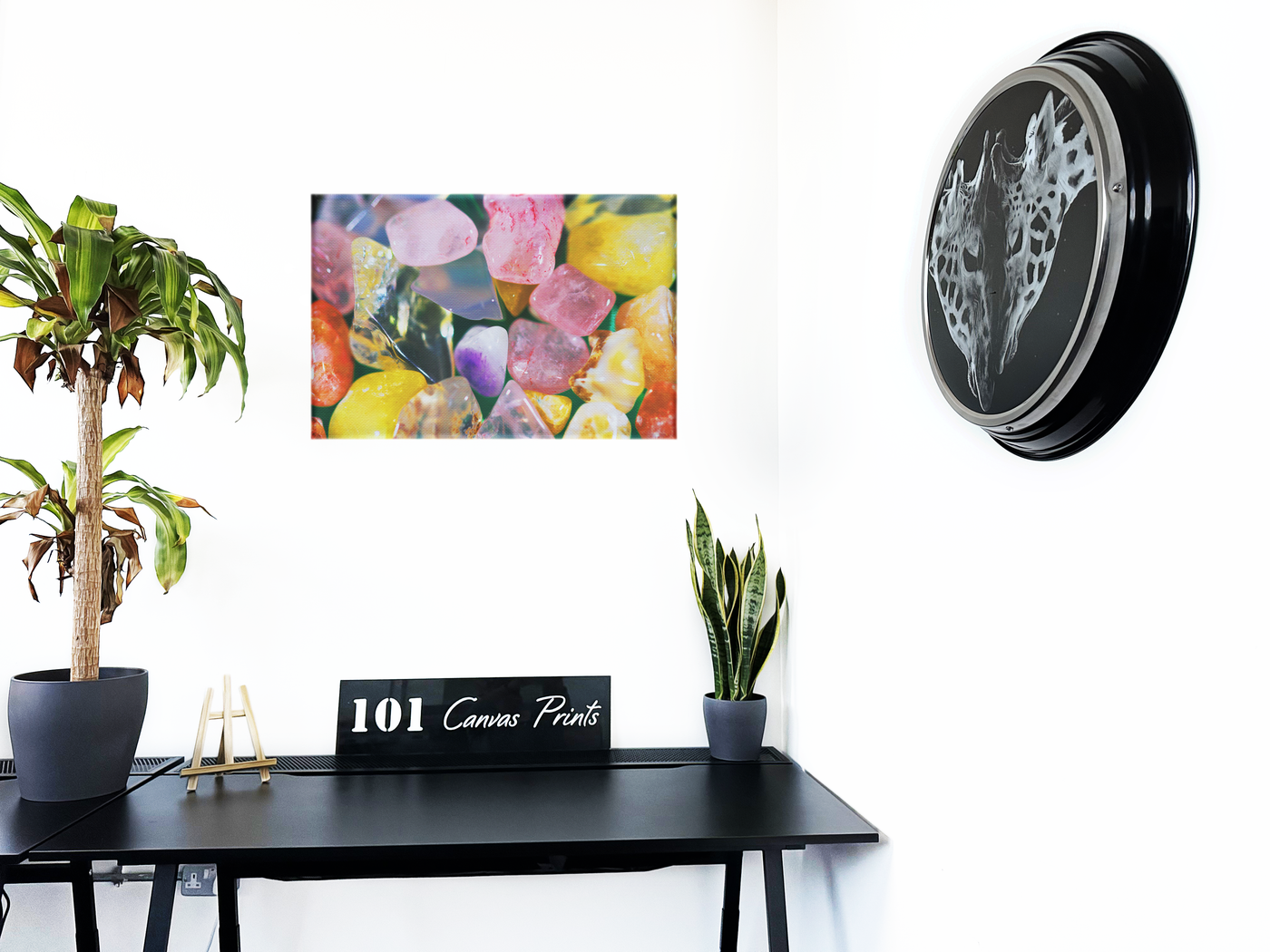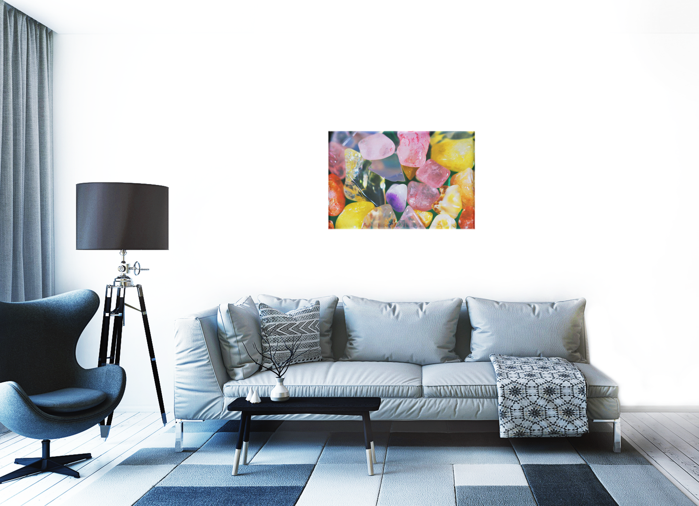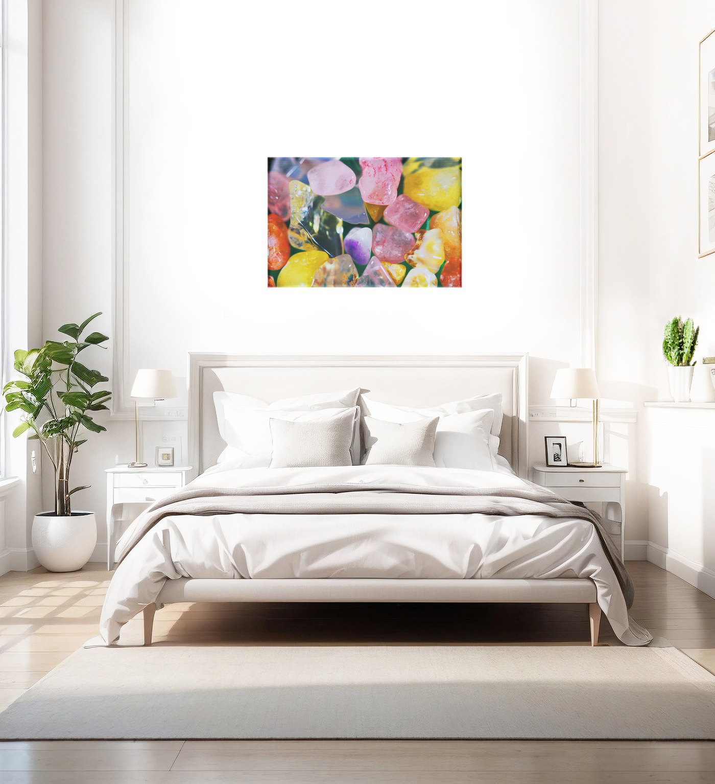 This captivating Canvas print showcases a vibrant collection of gemstones, each one a unique marvel of nature's artistry. The composition fills the frame with an assortment of polished stones, creating a mesmerising tapestry of colour and texture. From soft pinks and sunny yellows to deep purples and clear crystals, the diversity of hues is truly remarkable.