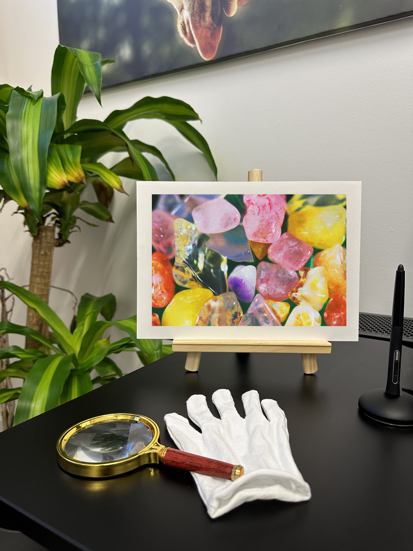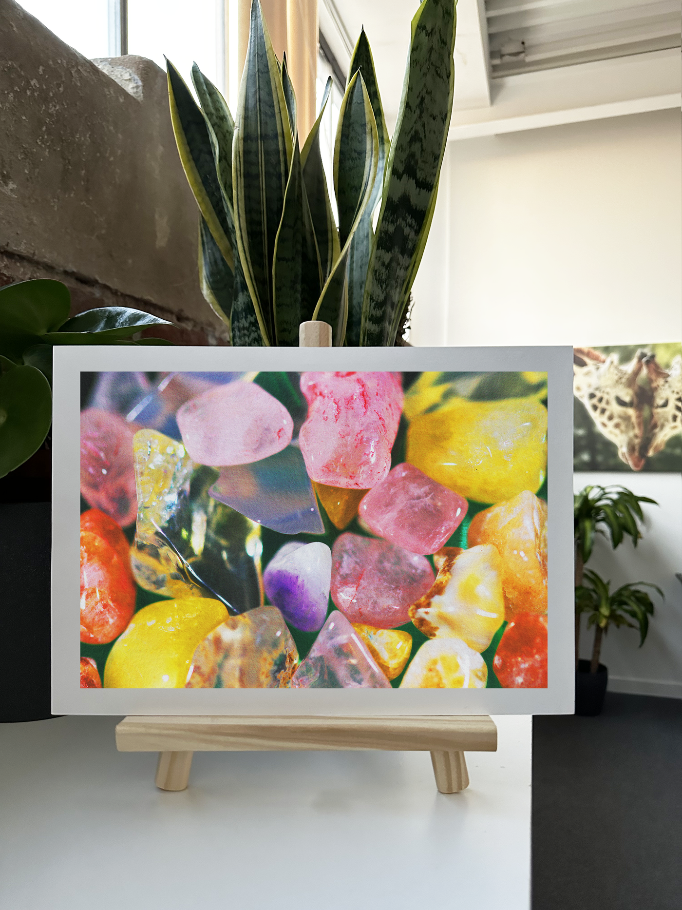 This captivating Fine Art print showcases a vibrant collection of gemstones, each one a unique marvel of nature's artistry. The composition fills the frame with an assortment of polished stones, creating a mesmerising tapestry of colour and texture. From soft pinks and sunny yellows to deep purples and clear crystals, the diversity of hues is truly remarkable.