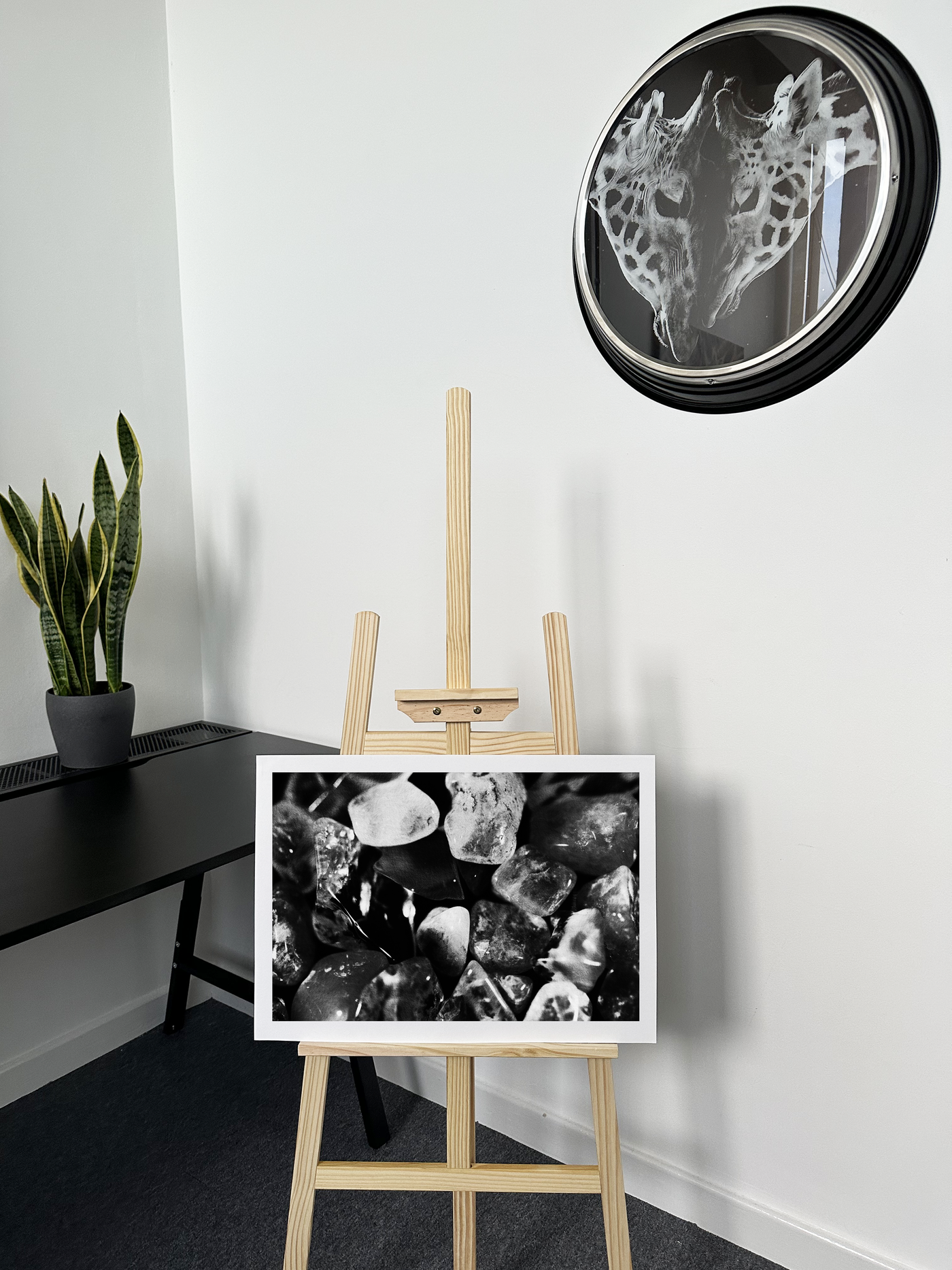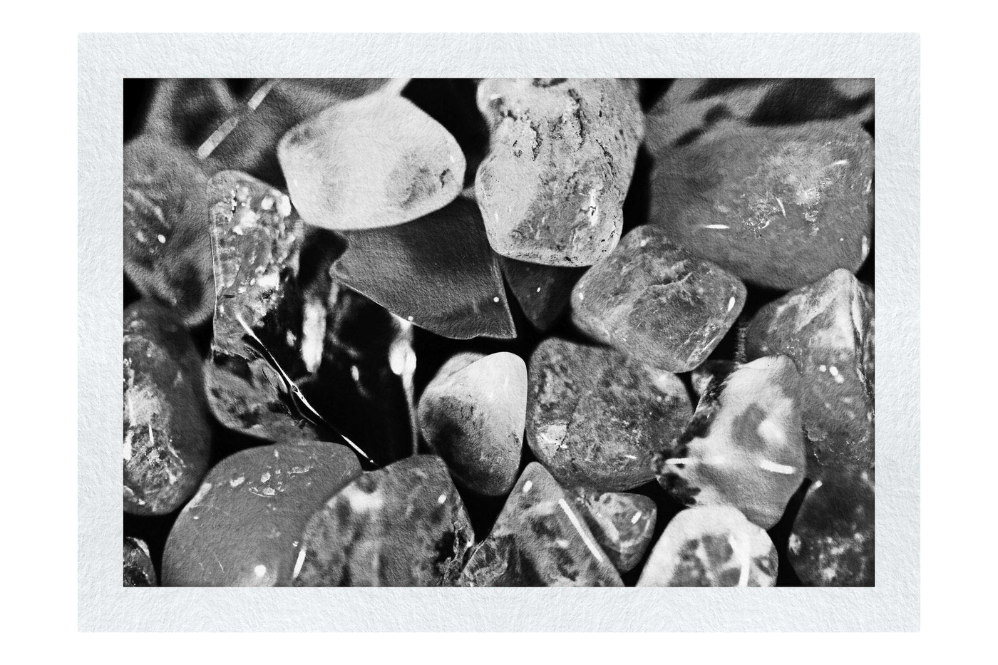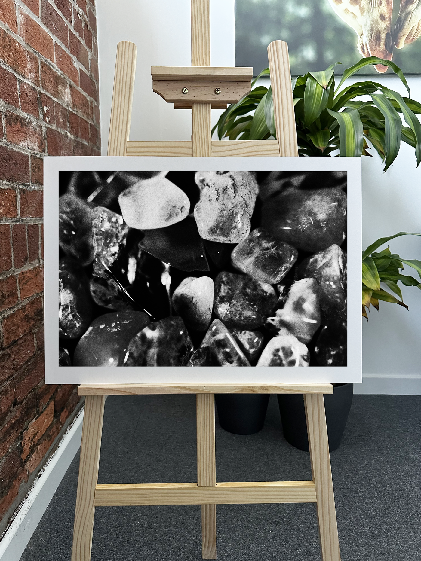 This captivating Monochrome Fine Art print showcases a vibrant collection of gemstones, each one a unique marvel of nature's artistry. The composition fills the frame with an assortment of polished stones, creating a mesmerising tapestry of Monochromatic tones and texture. From light to dark gradients the diversity of hues is truly remarkable.