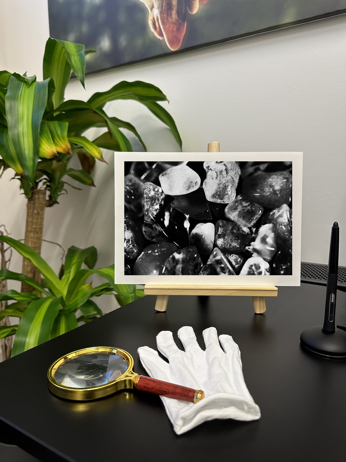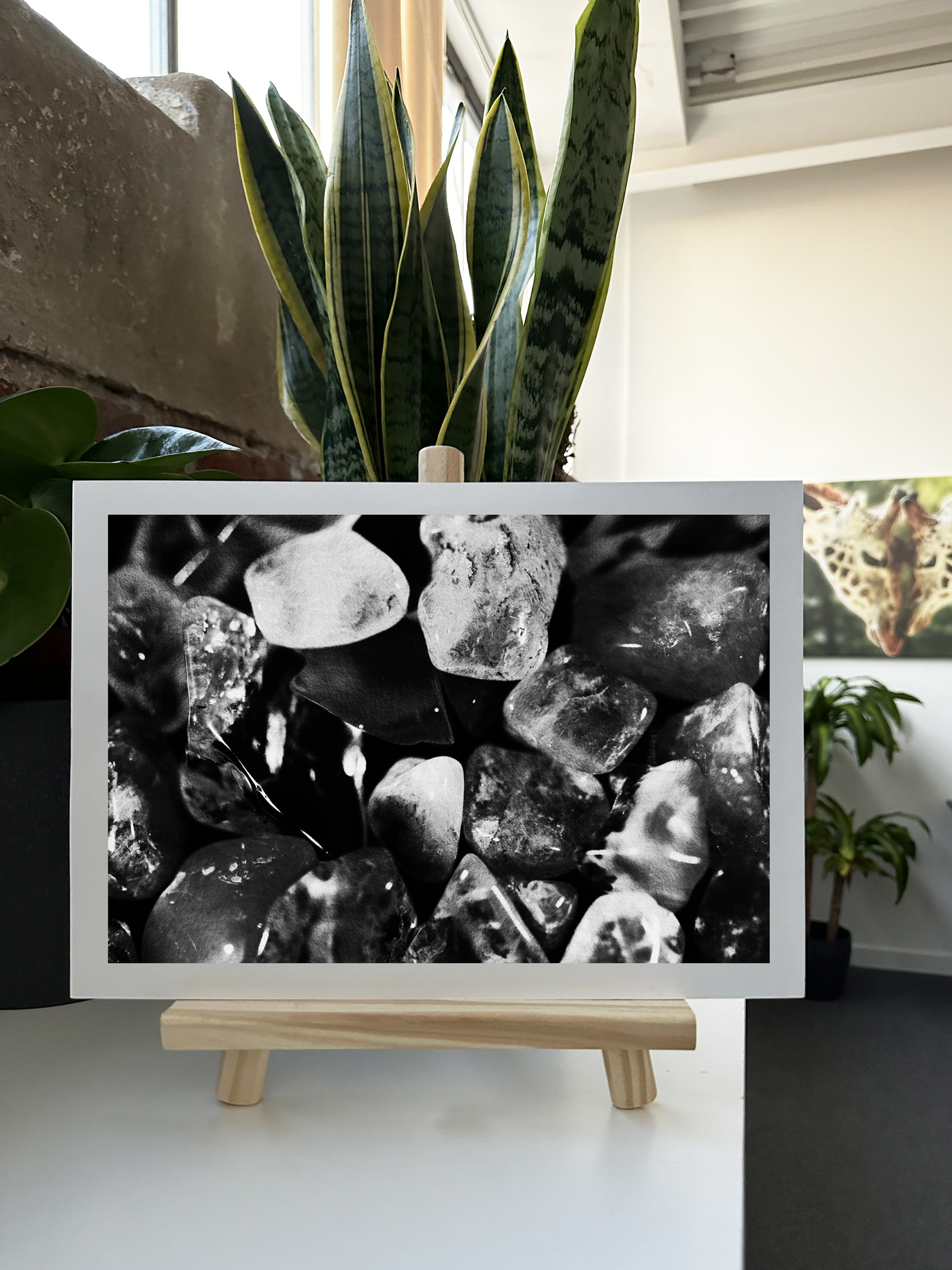 This captivating Monochrome Fine Art print showcases a vibrant collection of gemstones, each one a unique marvel of nature's artistry. The composition fills the frame with an assortment of polished stones, creating a mesmerising tapestry of Monochromatic tones and texture. From light to dark gradients the diversity of hues is truly remarkable.