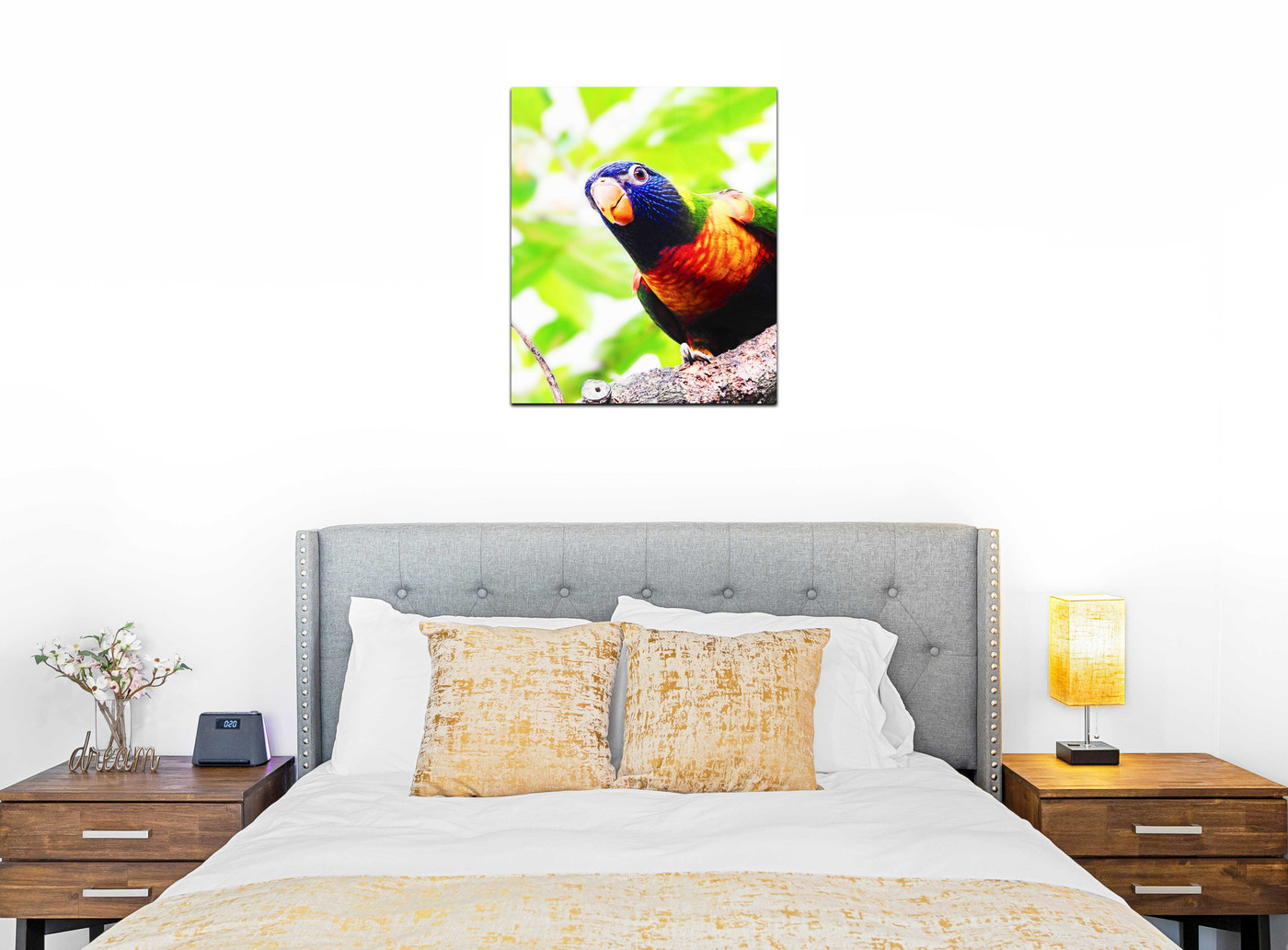 This Acrylic print features a gorgeous shot of a colourful lorikeet perched on a branch of a tree, looking down towards the camera, and is ideal as part of your home or office décor. The colours and picturesque scenery in this print will act as an instant mood booster and remind you to seek out the beauty in life.
