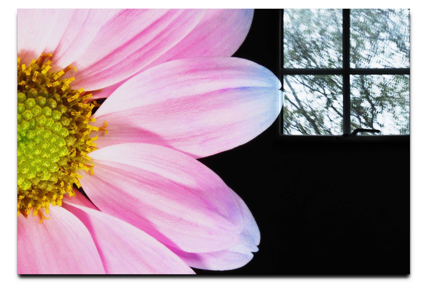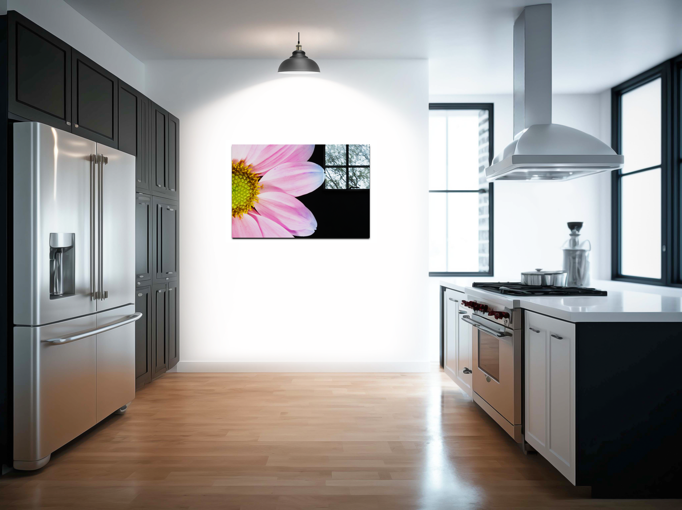 This stunning acrylic-set print showcases the delicate beauty of a single flower in breathtaking detail. The composition is bold yet intimate, with the pale, graceful petals and vivid yellow centre commanding attention against a rich, dark background. This striking contrast creates a powerful visual impact, inviting the viewer to explore every intricate detail of the bloom.