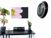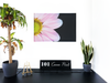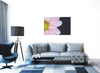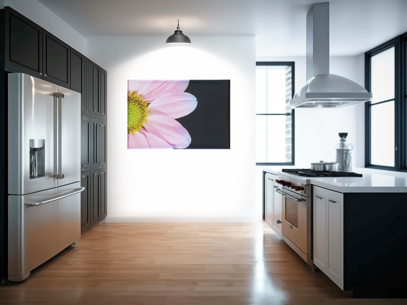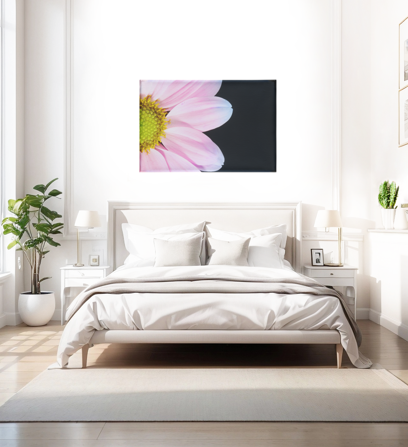 This exquisite Canvas print captures the ethereal beauty of a single daisy-like flower in stunning detail. The composition is a masterful study in simplicity and contrast, with the soft, pale petals and vibrant yellow centre set against a deep, dark background. This juxtaposition draws the viewer's eye directly to the flower, emphasising its delicate form and intricate details.