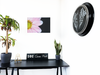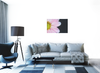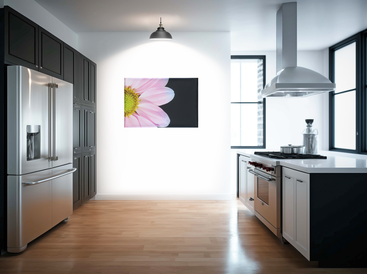 This exquisite Canvas print captures the ethereal beauty of a single daisy-like flower in stunning detail. The composition is a masterful study in simplicity and contrast, with the soft, pale petals and vibrant yellow centre set against a deep, dark background. This juxtaposition draws the viewer's eye directly to the flower, emphasising its delicate form and intricate details.
