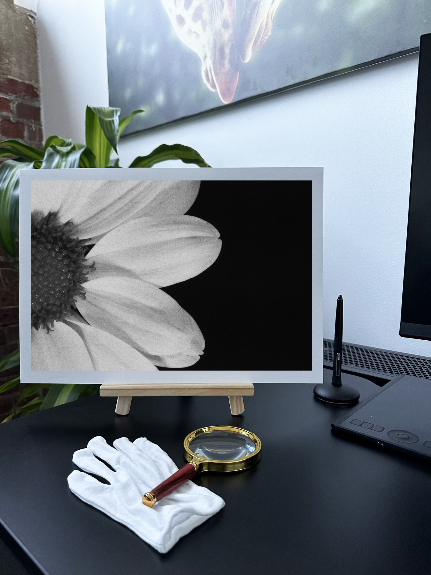 Our carefully handmade monochrome fine art prints are produced on Hahnemühle 308 matte cotton rag paper using Epson archival inks for exceptional detail and color accuracy. Each print features clean, precise edges and a textured surface that brings depth and richness to your chosen artwork, creating a gallery-worthy presentation.